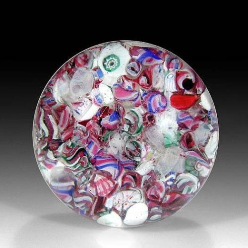 Antique New England Glass Company scrambled millefiori paperweight, with whole and partial complex canes, among sections of colored filigree and white latticinio. Surface wear. Diameter 2 7/16".