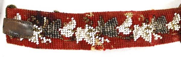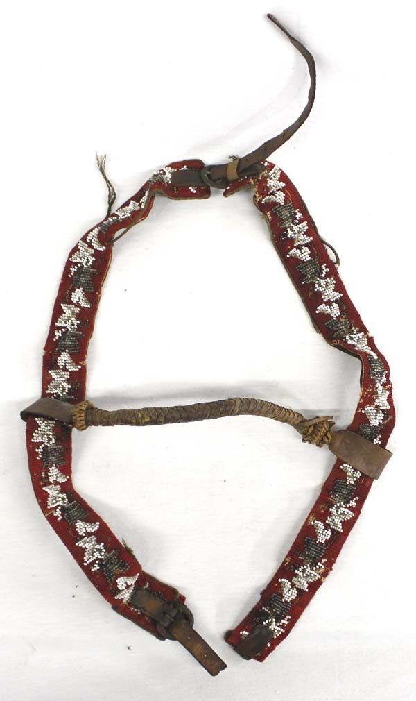 Antique Native American Beaded Leather Browband Headstall, measures 9'' x 40'', leather damage in buckle area, some fraying on borders, some missing beadwork