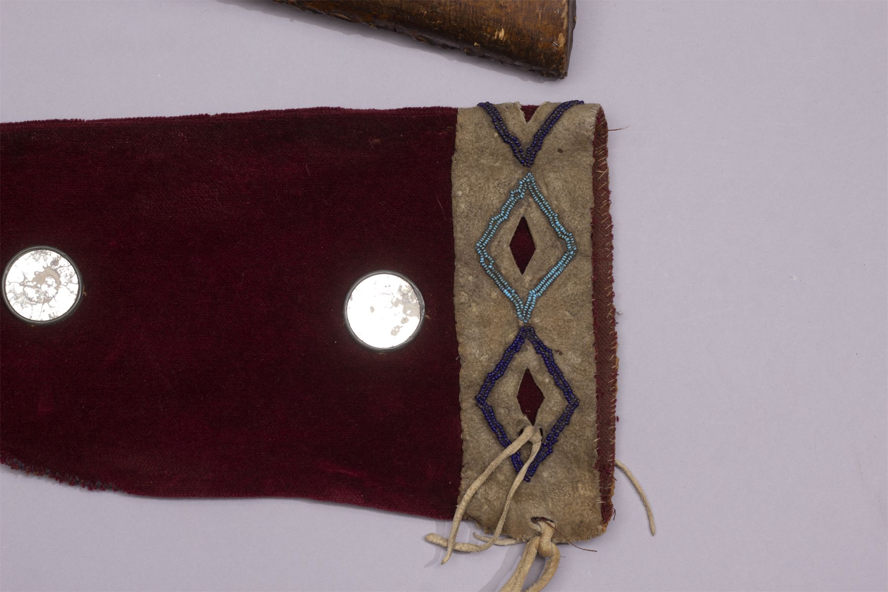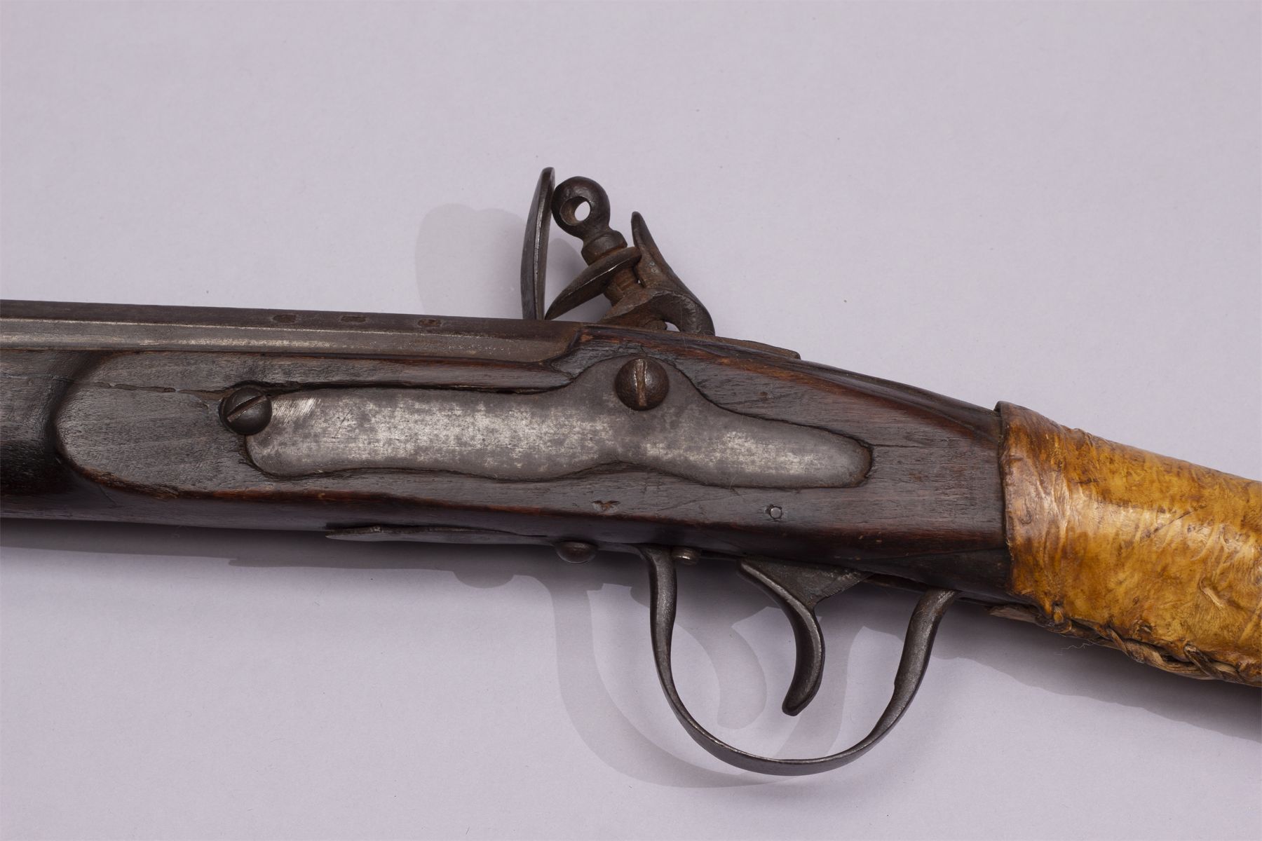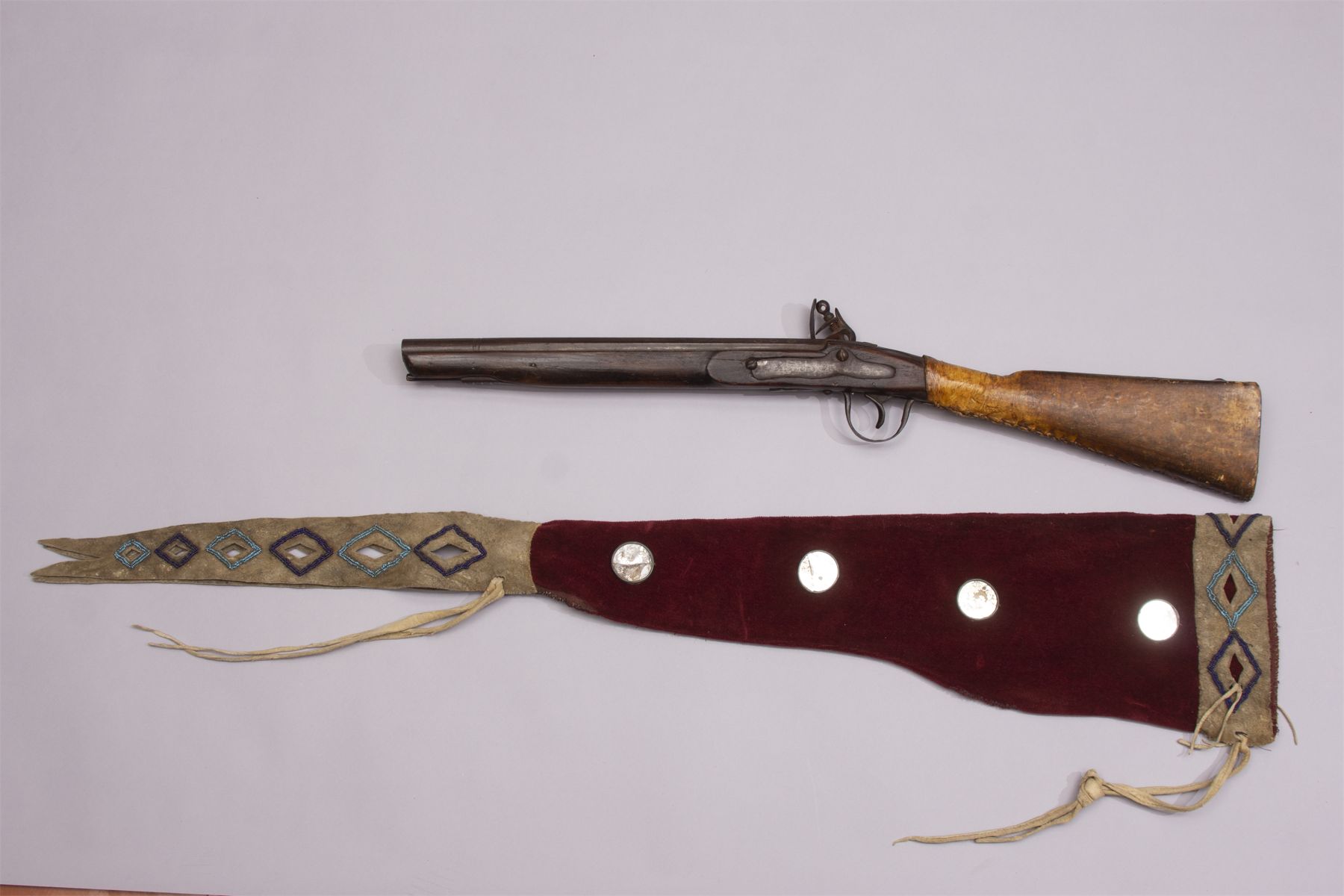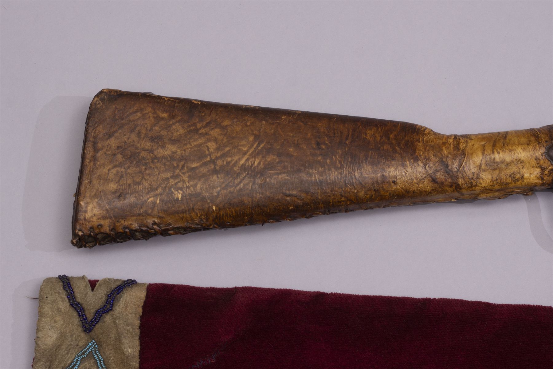 Antique flintlock marked "London" rifle wrapped in rawhide on butt stock cut down from original length to 32". Accompanying scabbard on trade cloth and hide with decorative beading of two shades of blue in diamond patterns and four signal mirrors.