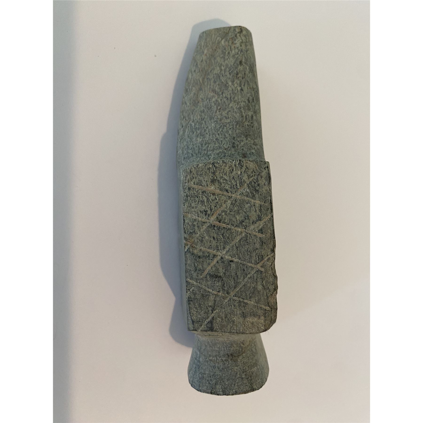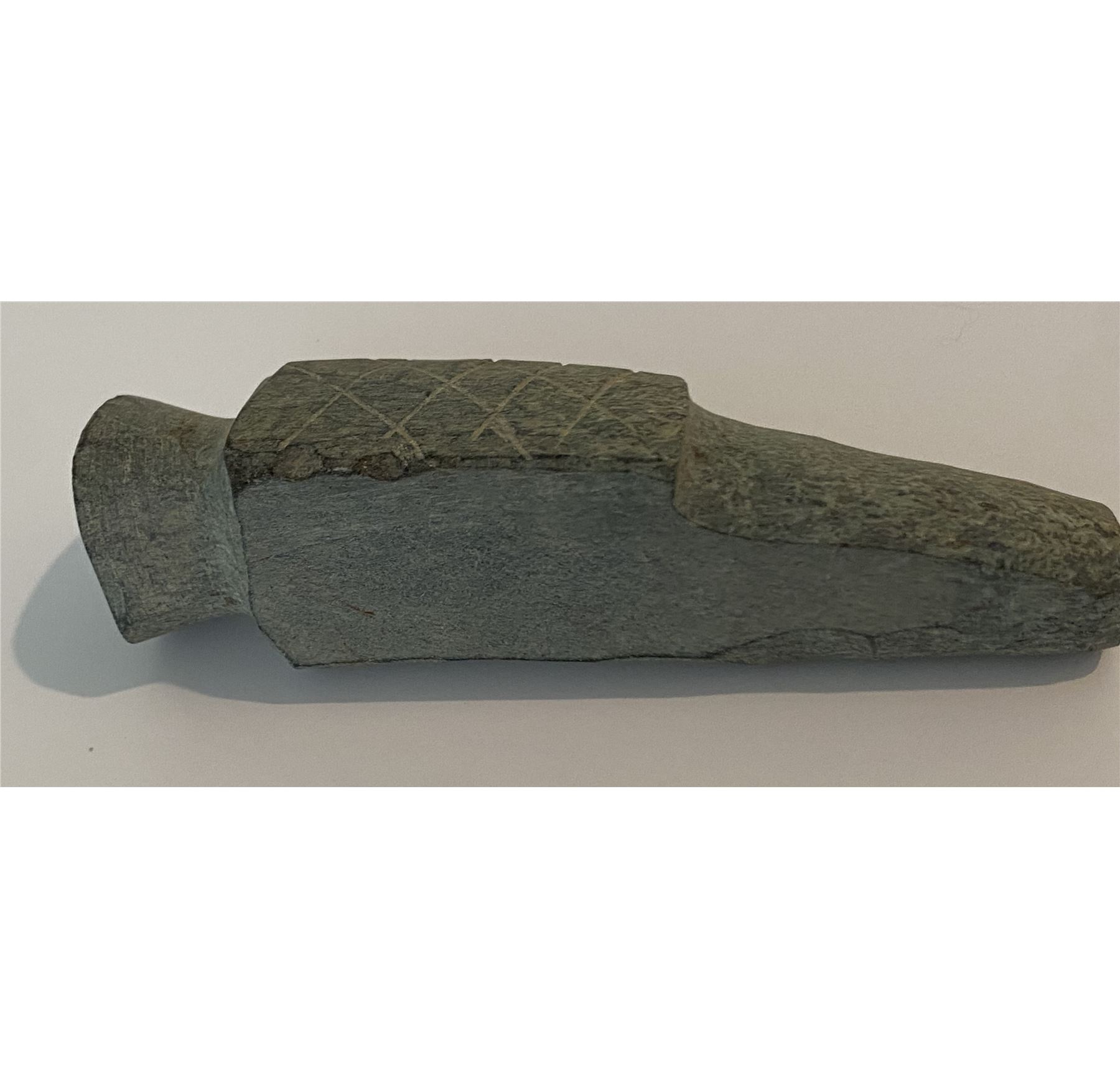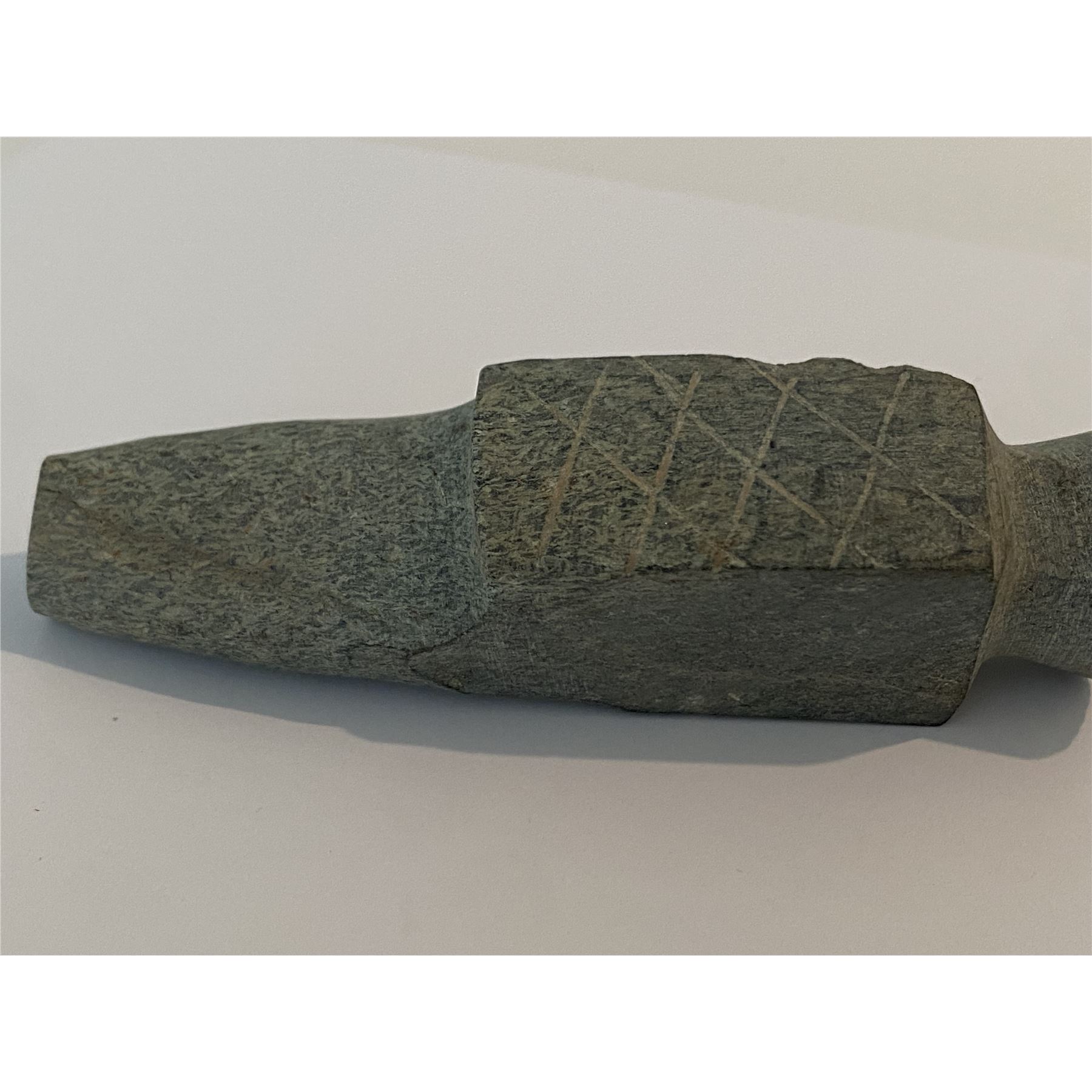 This antique 19th century Native American fishing net sinker boasts intricate engravings of a birdhead, showcasing the craftsmanship of the Cherokee Tribe. The sinker has been previously owned but remains in good working condition. measures 4" long