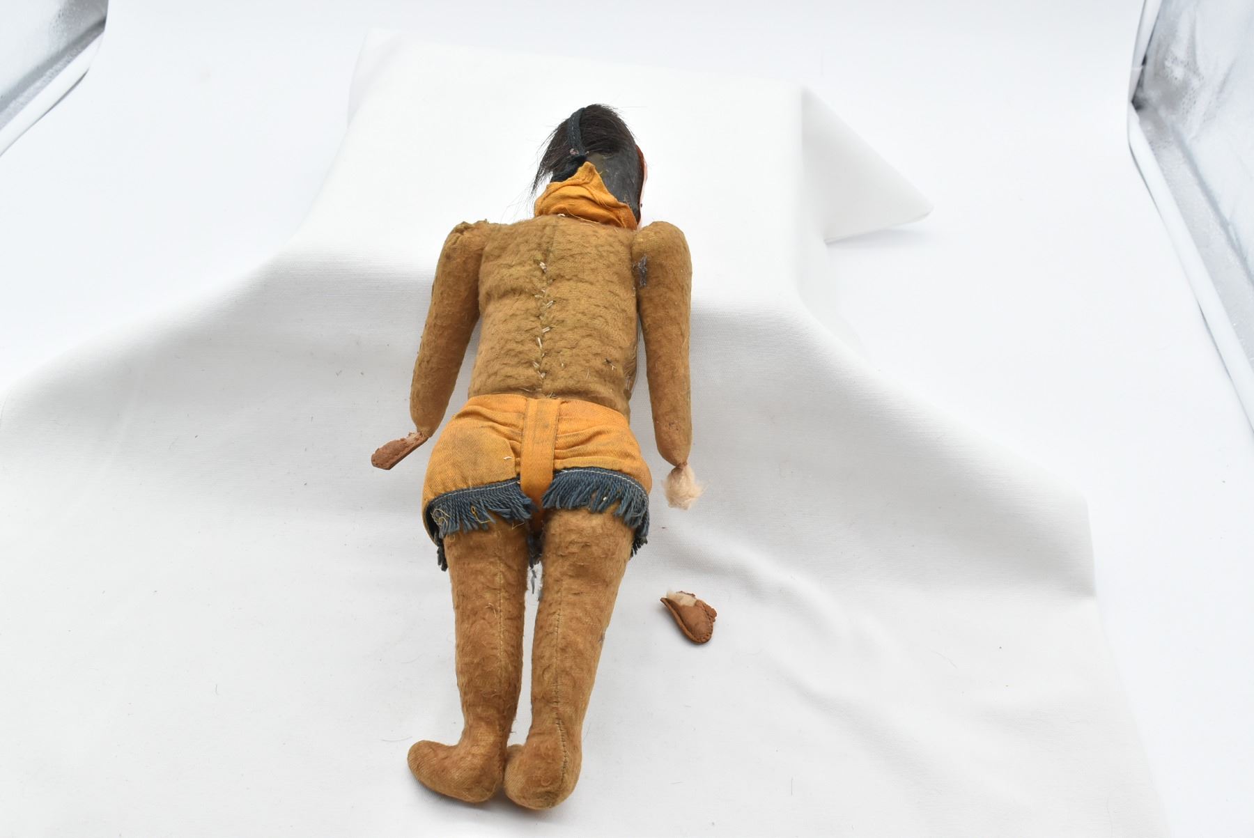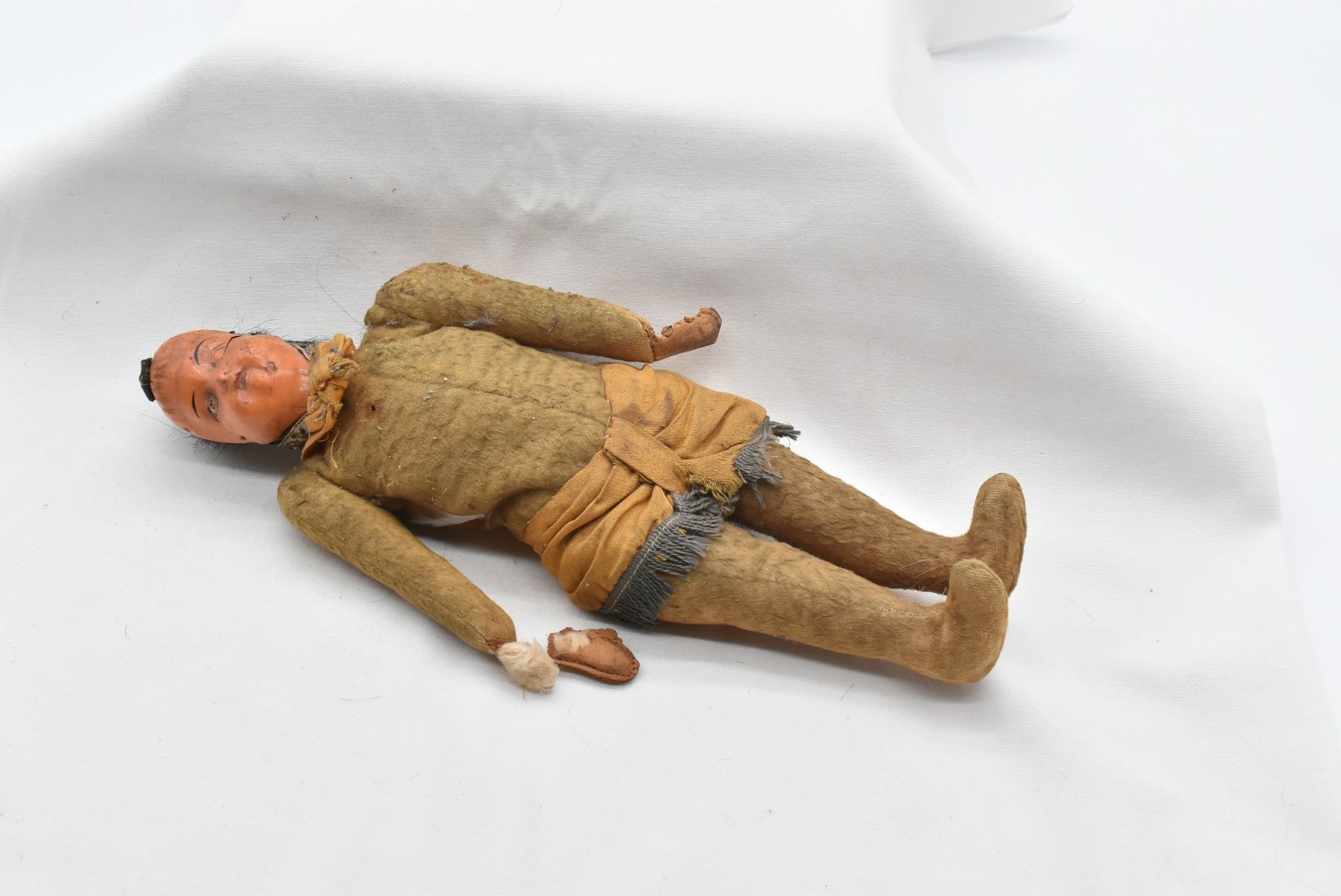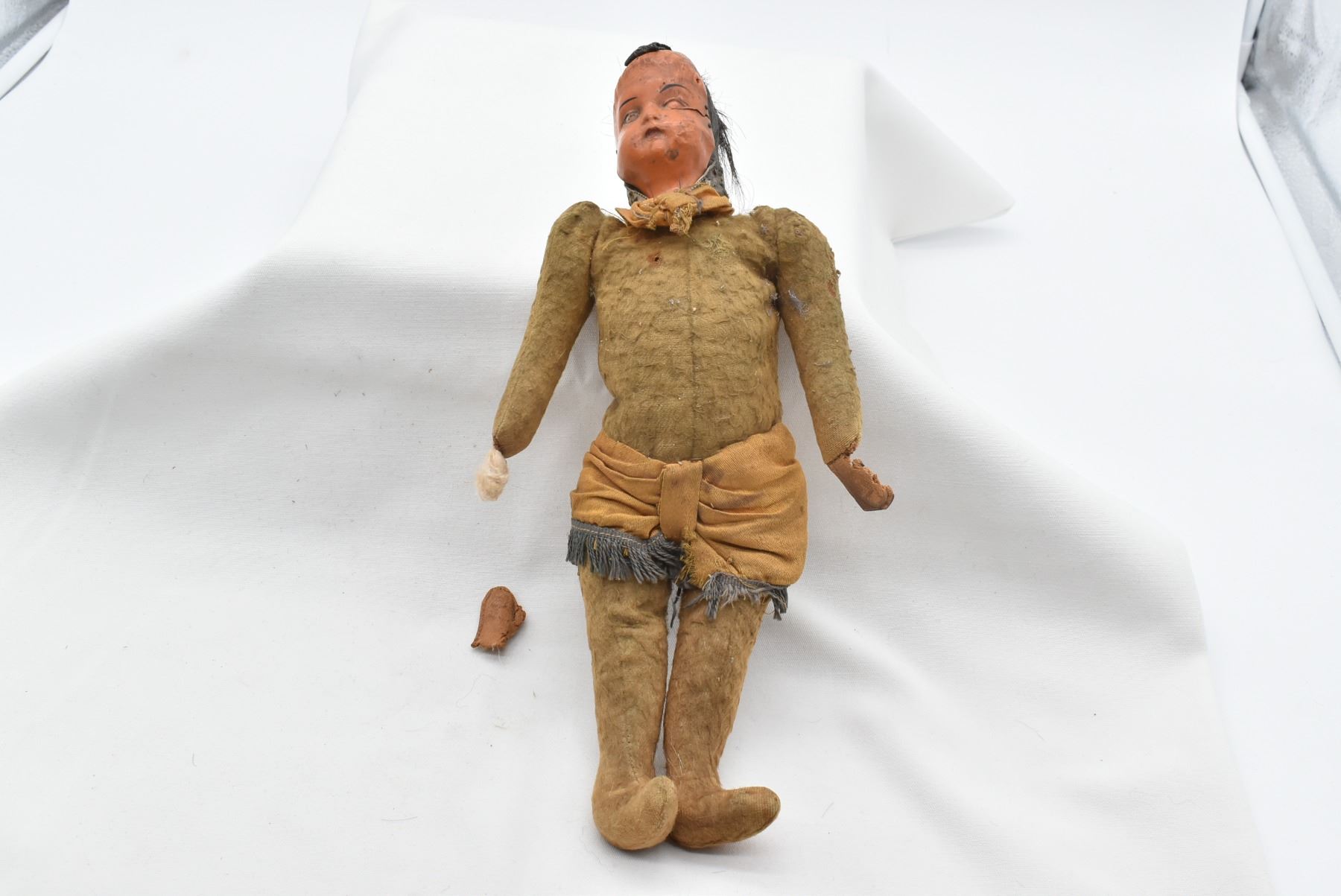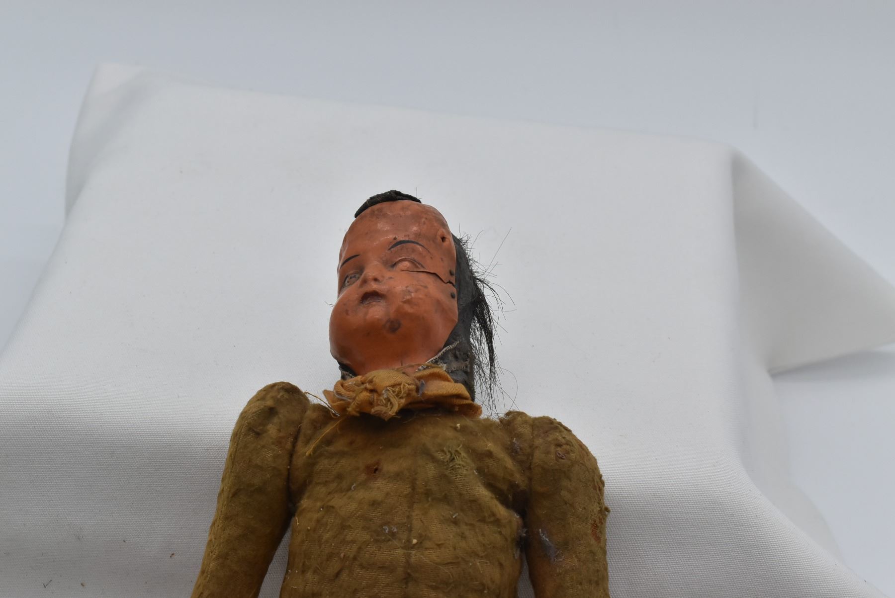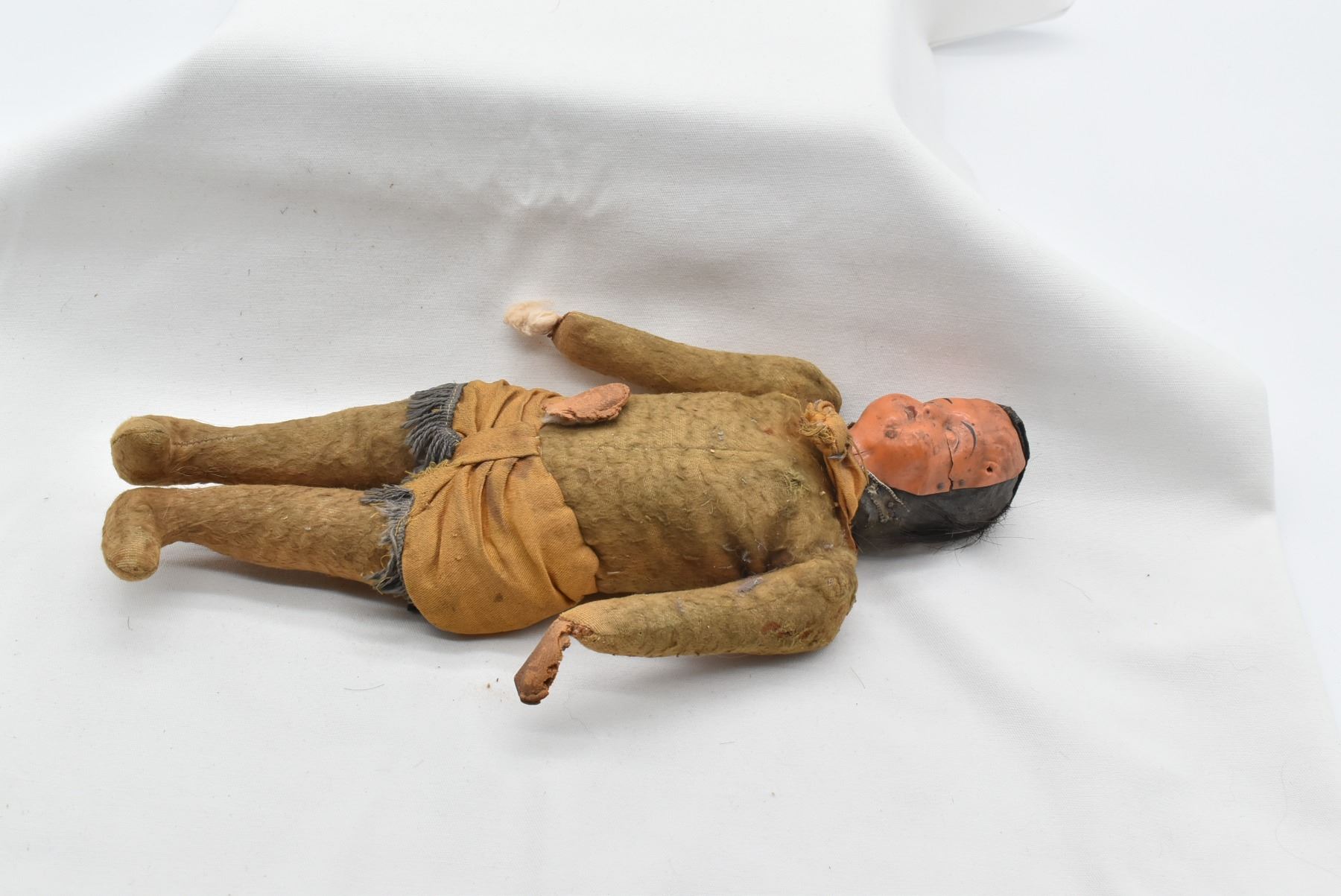 Antique Native American Doll, celluloid face, glove is not on hand (however it is included), measures 6'' x 11.5'', perhaps an early Armand Marseille doll, very fragile