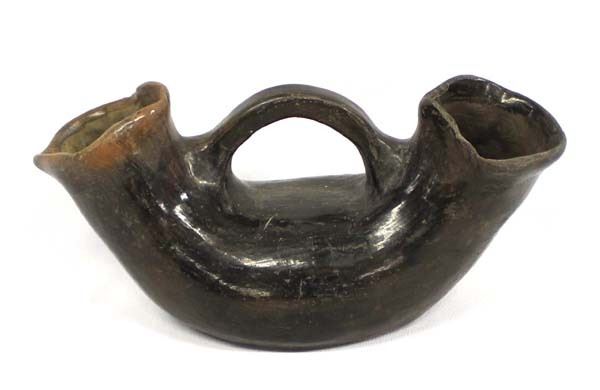 Antique Native American Santo Domingo Pottery, double spouts, single handle, measures 9'' x 4'' x 3.5'', chips in rim on one side, fluted spouts, ca. early 1900's