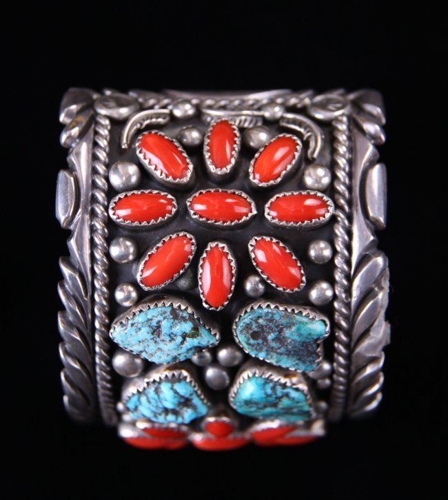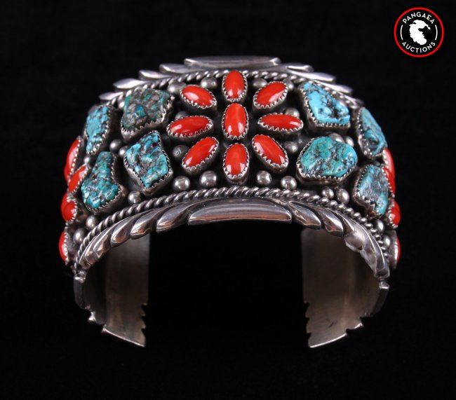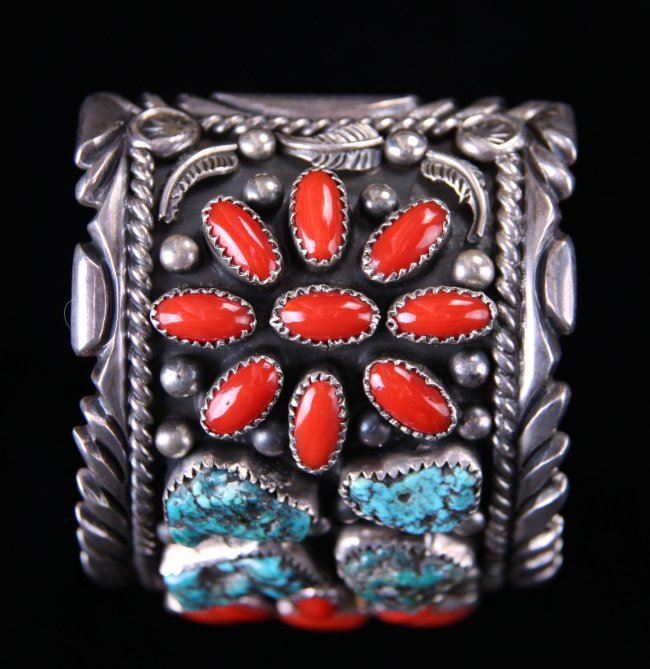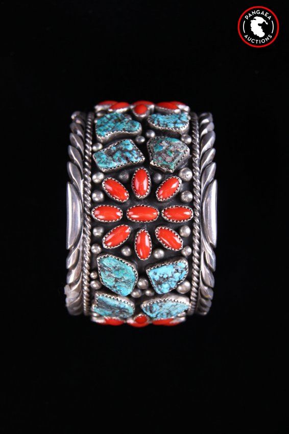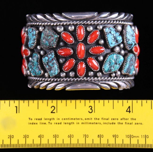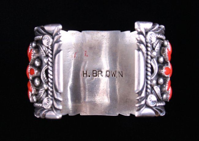Antique Native American sterling silver bracelet with red coral and turquoise gemstones. Signed "H. Brown." SIZE: see attached ruler photo. Photos are part of the description representing the condition report and can be used for authentication prior to the auction date. Pangaea Auctions urges Bidder's to view all attached photos in detail. #(American, Antique, Jewelry, Bracelet, 925 Sterling Silver, Turquoise & Red Coral, Native American)