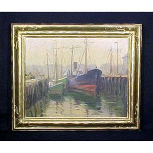 Here is a nice nautical oil painting on canvas of boats docking. It appears to be a New England subject similar to the Gloucester, Massachusetts harbor scenes. It is in excellent condition and signed lower right corner "E G Drew 37." It is in a very nice carved wood and gold gilt frame. EG Drew is a listed artist. Canvas size is 18" X 14." Overall in frame it measures 22" x 18". The detail is exceptional. The work is inspiring with heavy layered brush strokes. The use of color, composition and light is very reminiscent of New England harbor life. If you have been looking for a great maritime painting you need to look no farther!