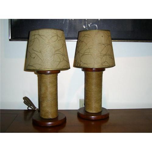 Two antique nautical themed lamps for the den or study. These desk lamps are made of tightly wound rope with solid wood bases and the original matching threaded fiberglass shades. These smaller size lamps are from the Lake Erie region here in Ohio. Insured shipping included!