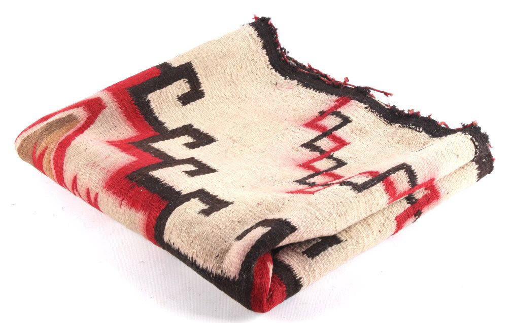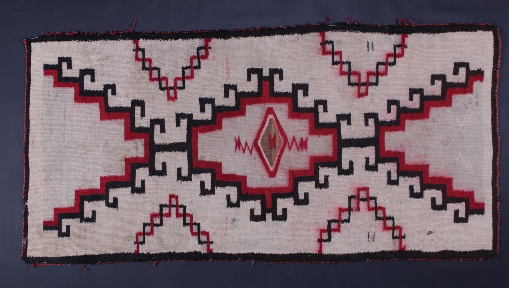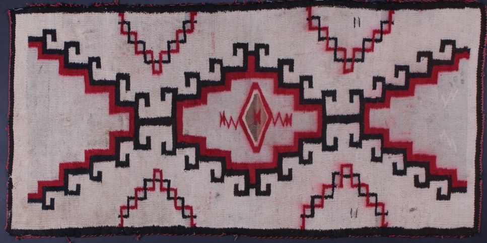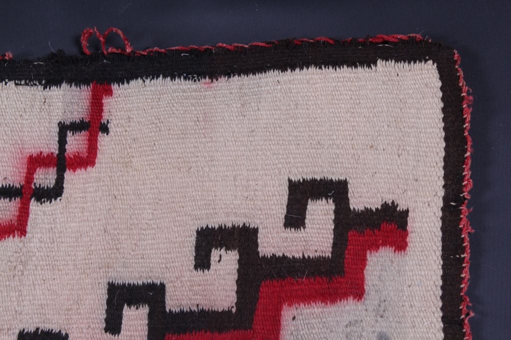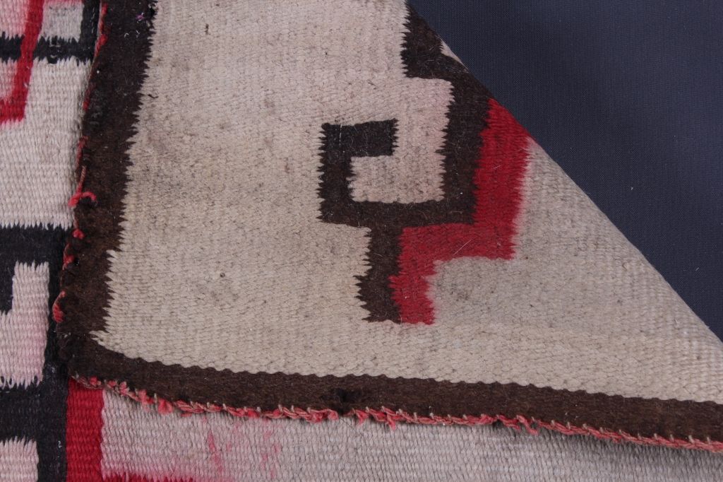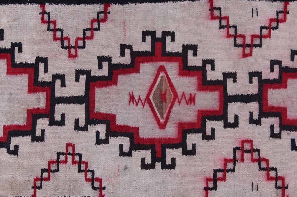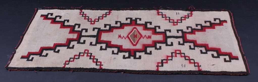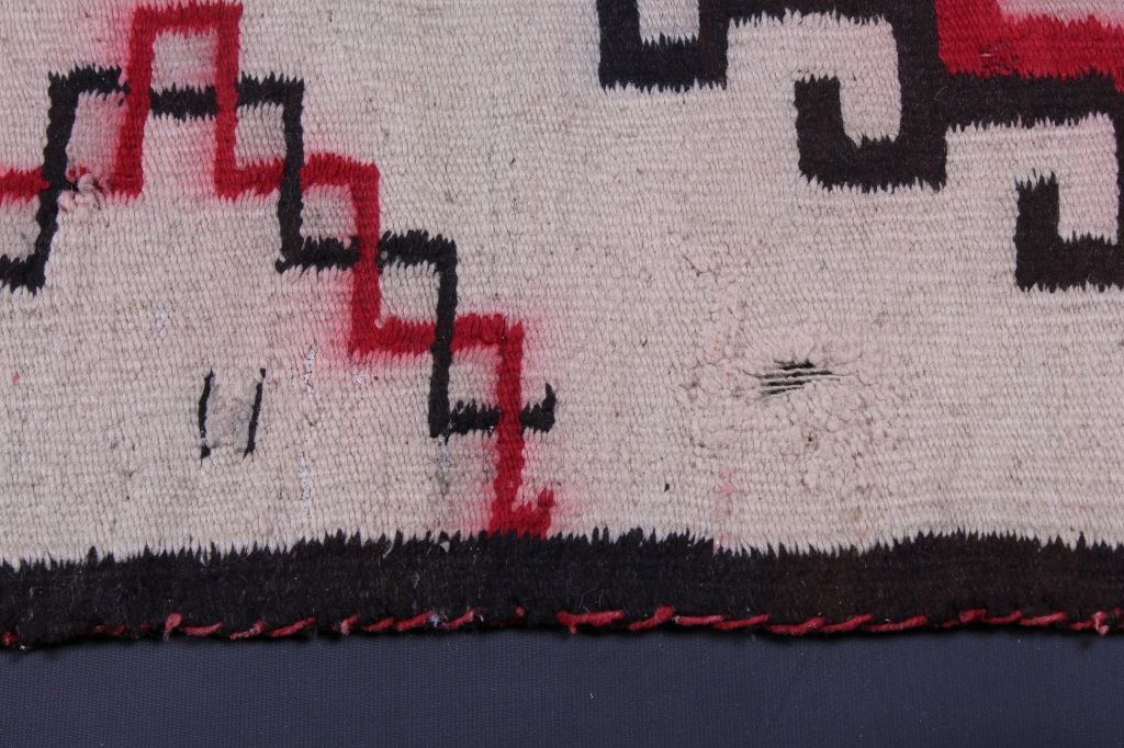 This is an early antique rug hand knotted from the Navajo Native American Indians. The rug shows a Ganado pattern. This piece shows some wear around the edges and color slightly bleeding, but is a very early collectible. Measures 30"x61"