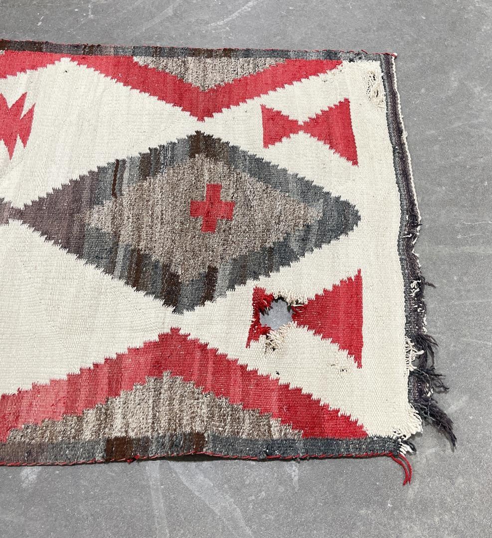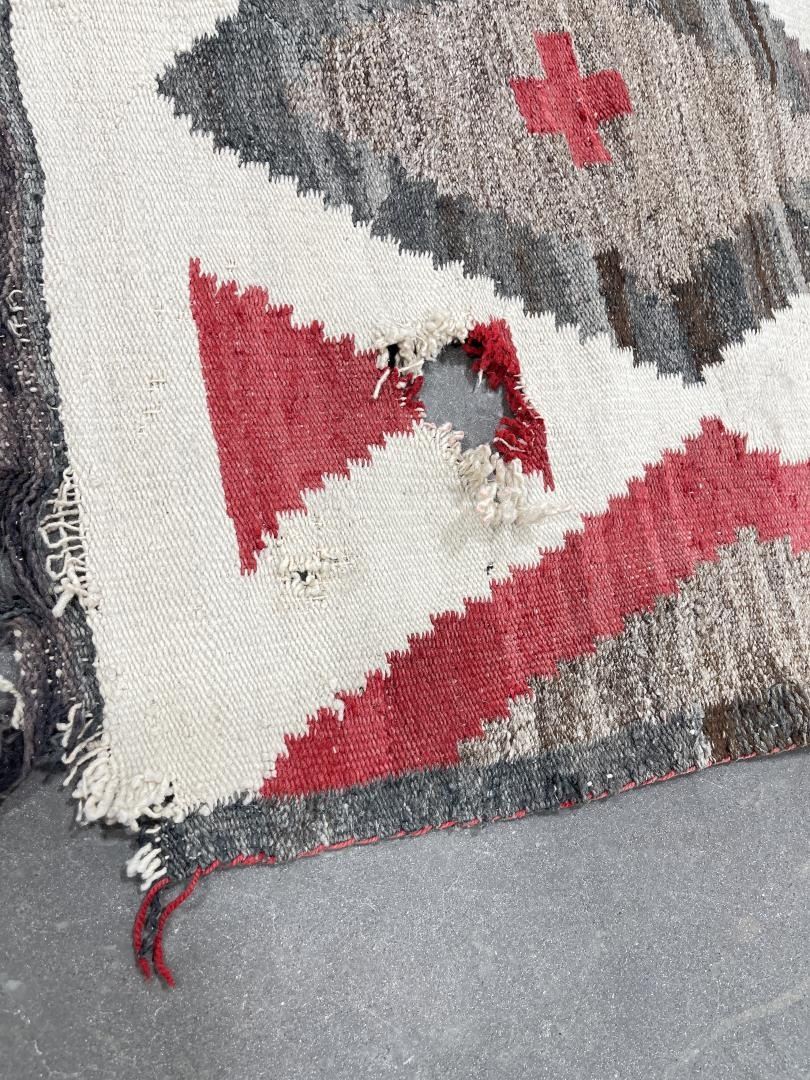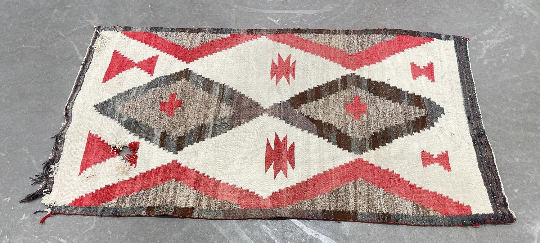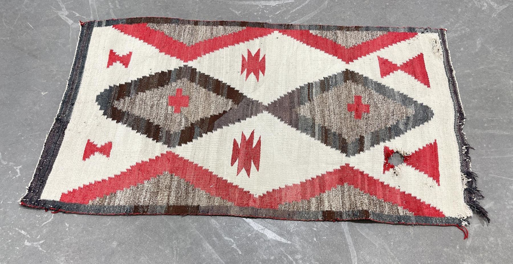Nice old rug. Has a hole as shown. 34.25" by 58".