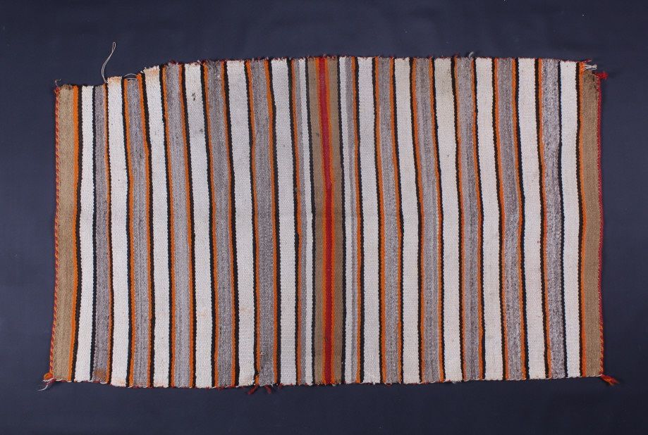 This is an original Navajo Native American Indian hand woven saddle blanket. The blanket shows orange, brown, tan, red, and grey. This shows some wear on the corners as it was used and early. This is an antique piece and measures 52"x31"