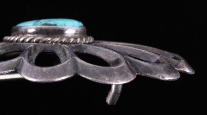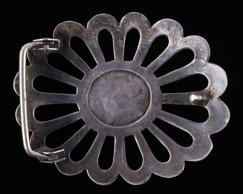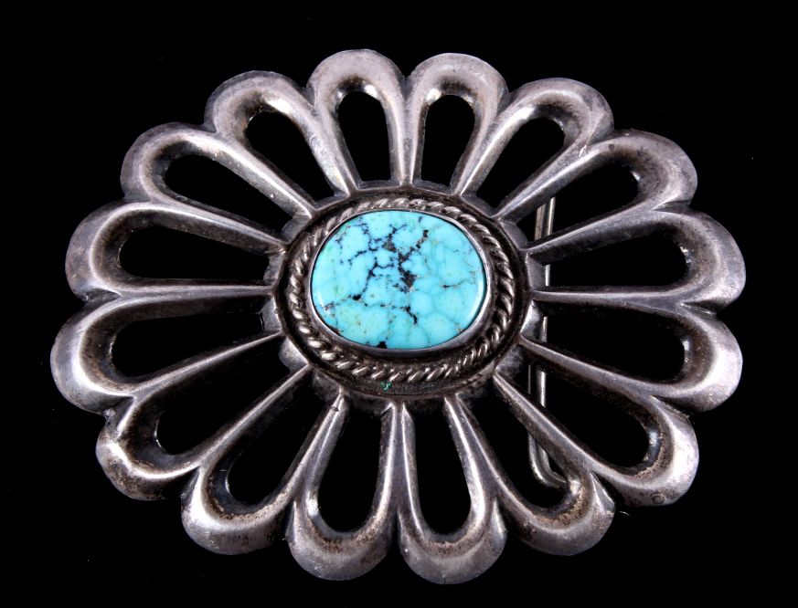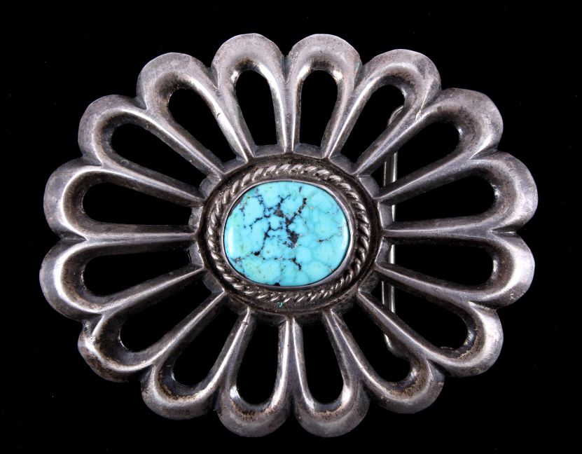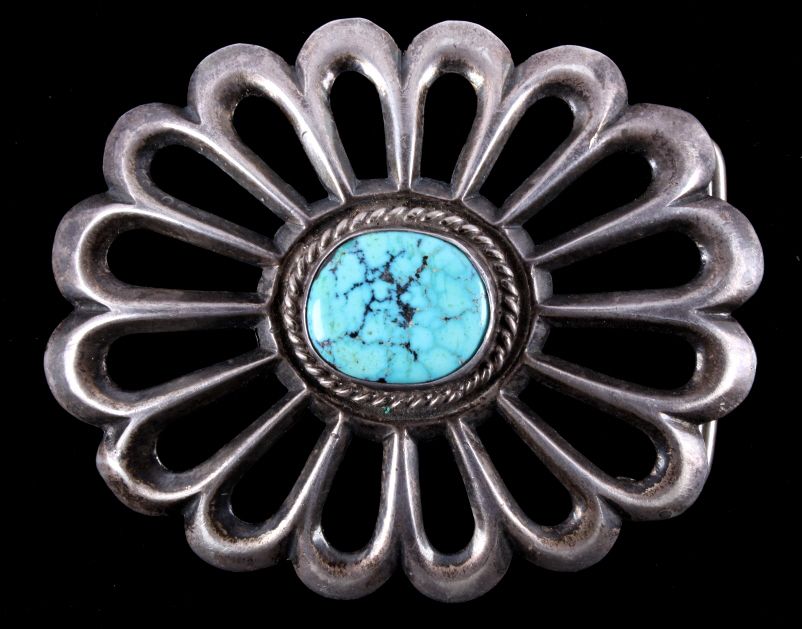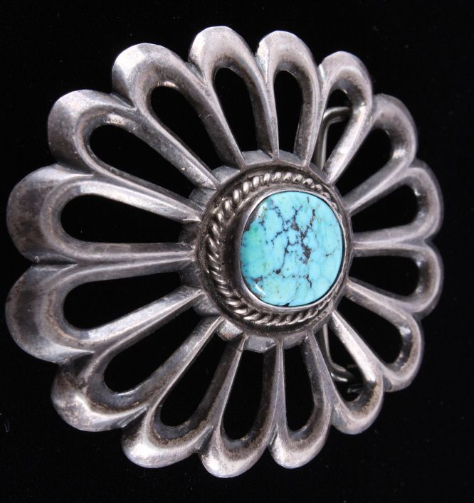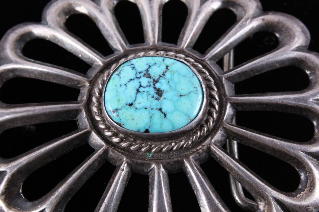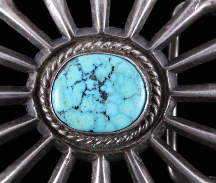 The piece is from the Navajo Native American Indians and shows a set turquoise stone with wonderful coloring. The buckle is an early pawn items and shows a wonderful worked and sand cast sterling silver design. The piece also has rope silver set around the stone. Measures 2 5/8"x3 1/4"