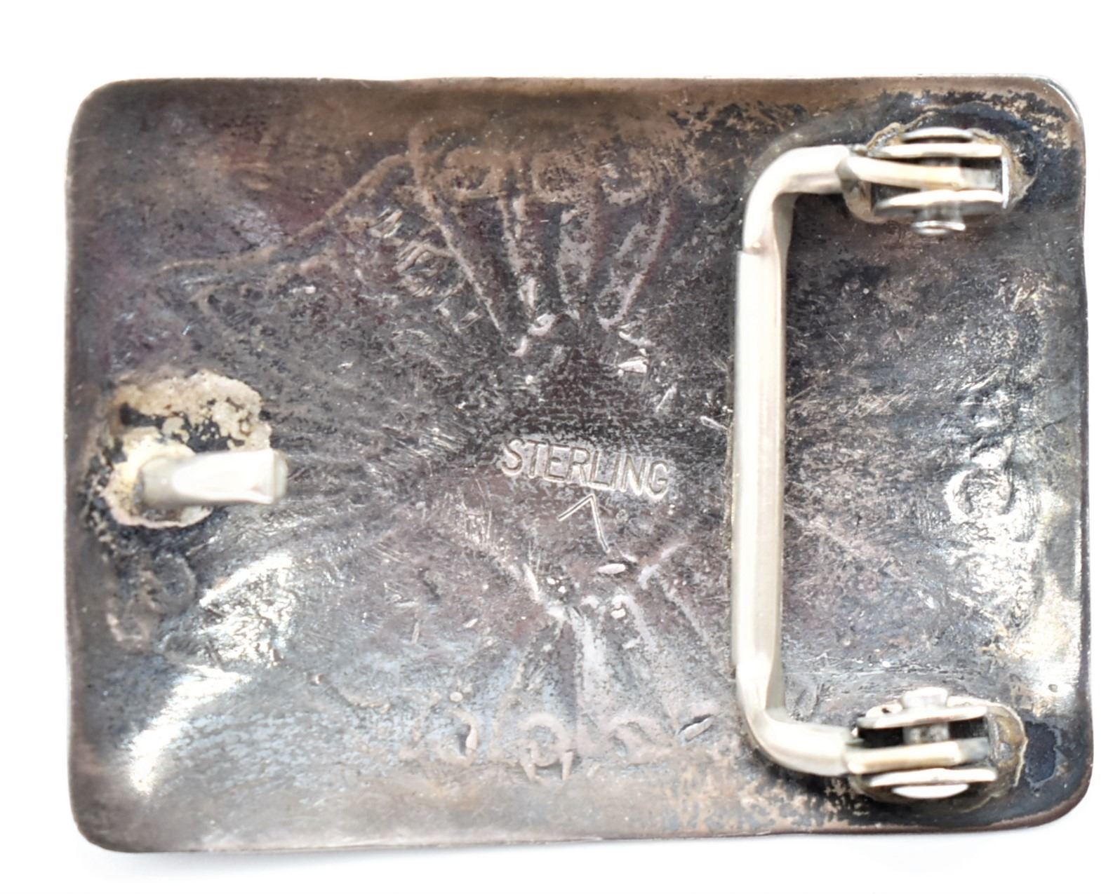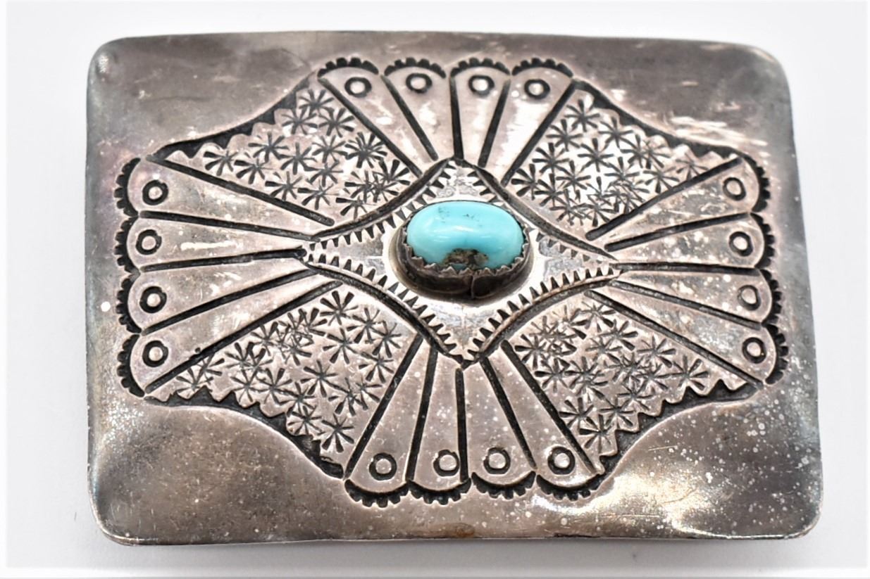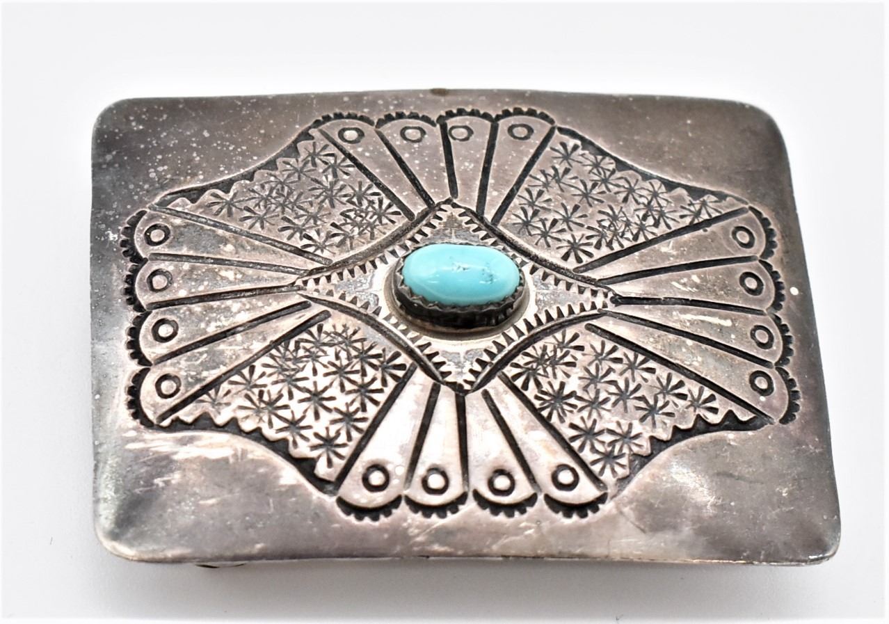 Historic Antique Navajo Sterling Turquoise Belt Buckle, hand stamped details, measures 2'' x 1.5'', stamped sterling