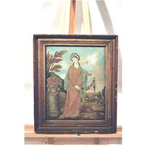 Here?s a really fine and wonderful early needlework item! First I can say that I believe this is a real early picture quite possibly from the late 17th century or early 18th century. It?s a great needlework picture and in very good condition actually. The detail and dimension is exceptional! The needlework is precise and every single stitch in place. I?m looking at this picture with a jewelers loop and it appears that the base material is early hand woven cotton with a background painted in watercolor as is the face and hands of the woman. The thread appears to be a combination of a raw silk, chenille and wool. In some spots appearing to be sort of stump work, with sections of the embroidery almost looking like trapunto - raised high above the surface. The frame is gold gilded wood under quite a bit of dirt with the normal amount of damage, wear and chipping to the surface exposing the Gesso underneath which appears to be original. I could not help myself and removed the recent brown paper backing on the frame which is very interesting. The picture is on a stretcher just like an oil painting and one early hand wrought nail is holding the stretcher in place. The picture has no rot or deterioration just a few acid burn rusty type spots which is expected with fabric of this age but they are very minute. It measures 12? x 10 5/8? overall and the sight size is 9? x 7?. The glass in the frame is a bit brittle but clear and it appears to be original. This came from a very fine estate. ...