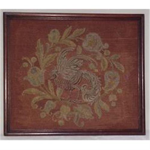 A framed antique needlework depicting flowers and leaves surrounding a Pheonix . 19'' x 17'' walnut frame. Needlepoint background and flowers, pheonix done in petite point. Some fading from age. Originally from a fire screen.