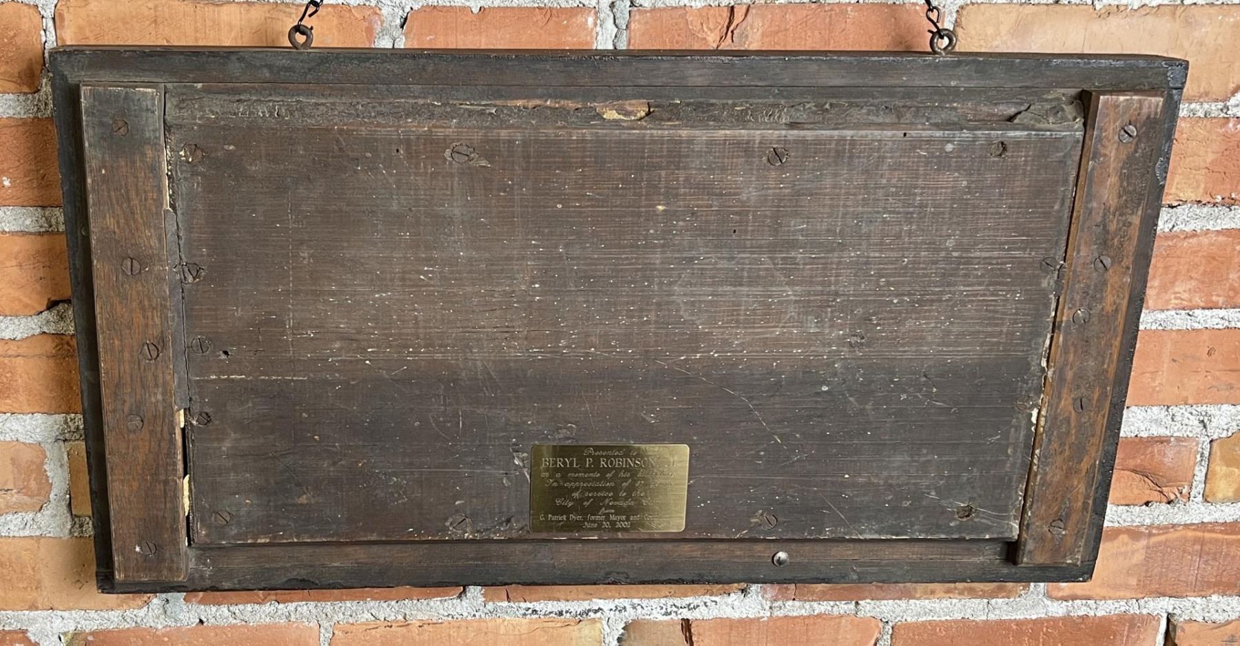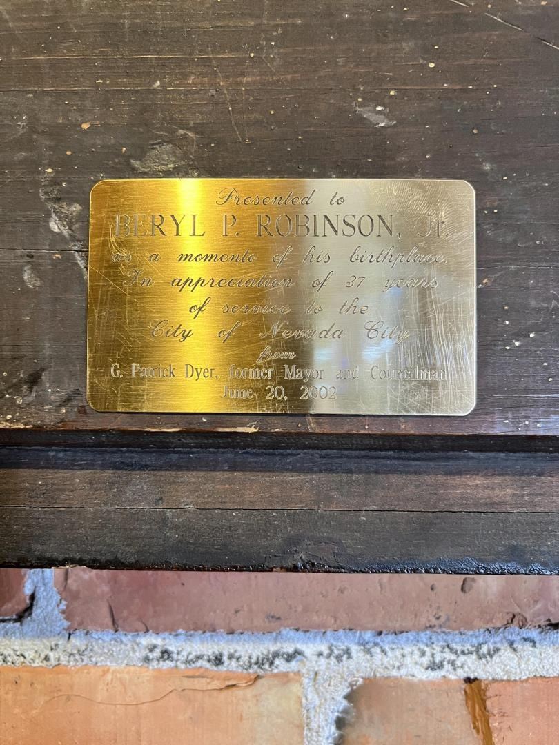 28" by 14 1/2". Presented to Beryl P. Robinson Jr, as a memento of his birthplace. In appreciation of 37 years of service to the City of Nevada City. From G. Patrick Dyer, former Mayor and Councilman 2002.
