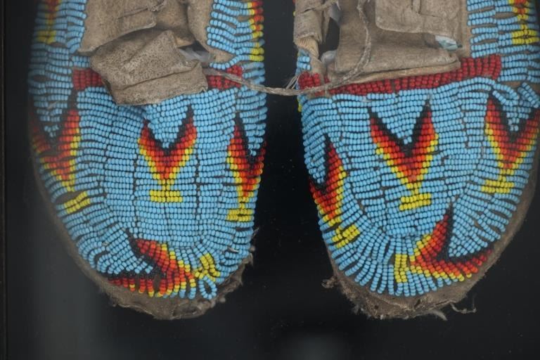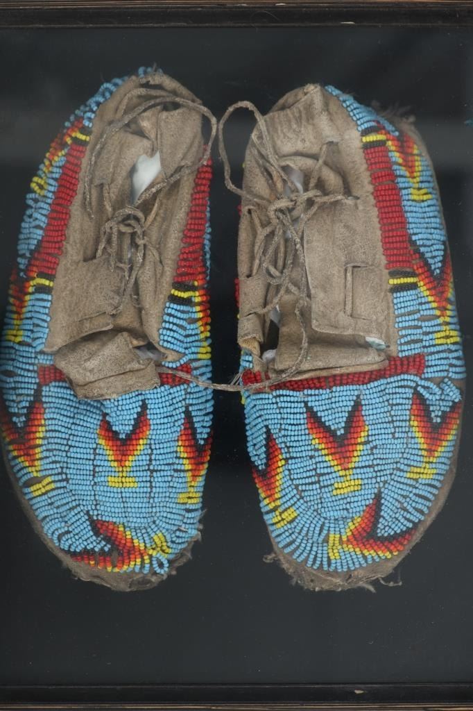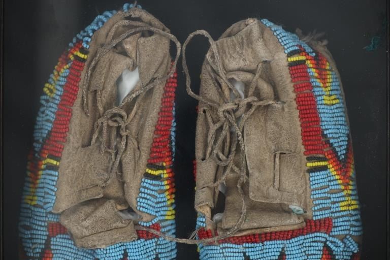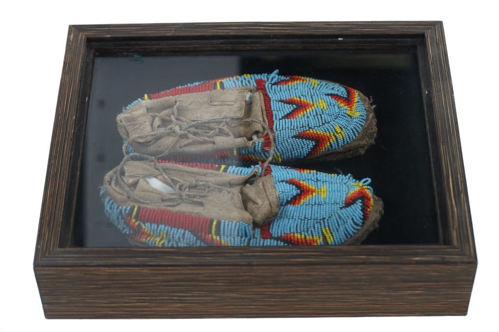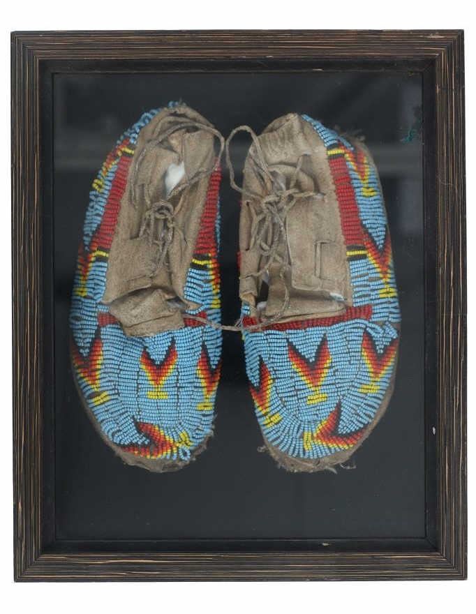 For your consideration this lot is a pair of Nez Perce Beaded Moccasins, circa late 19th to early 20th century, framed. This pair of well-worn moccasins made from tanned hide with geometric designs of glass seed beadwork of black, red, orange yellow and light blue. The Nez Perce people made moccasins from animal hides for generations. They used a variety of techniques to construct moccasins, including side-seam, one-piece, and two-piece styles. The Nez Perce have used a variety of traditional geometric and floral patterns in decorations and beadwork, along with representations of birds and animals. The moccasins are mounted in a shadow box display case with hardware on the reverse for wall hanging the case. Moccasins measure 3.5"W x 7.5"L approximately. Case measures 9.25"W x 11.25"L x 2.25"D, combined weight is 2lb, 6oz.