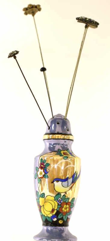 Antique Noritake sugar shaker used as hat pin holder with 5 antique hat pins.