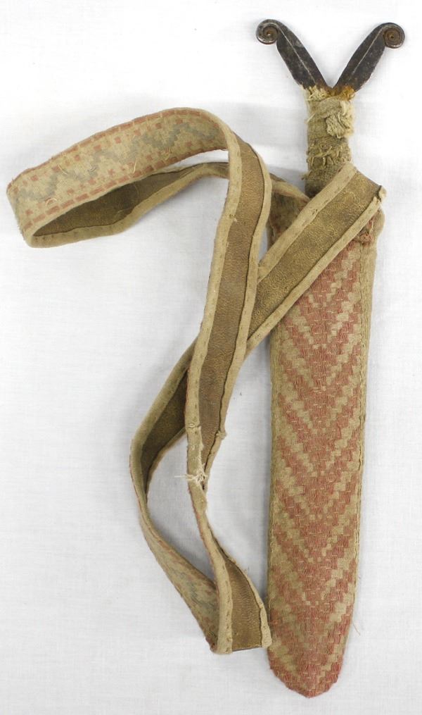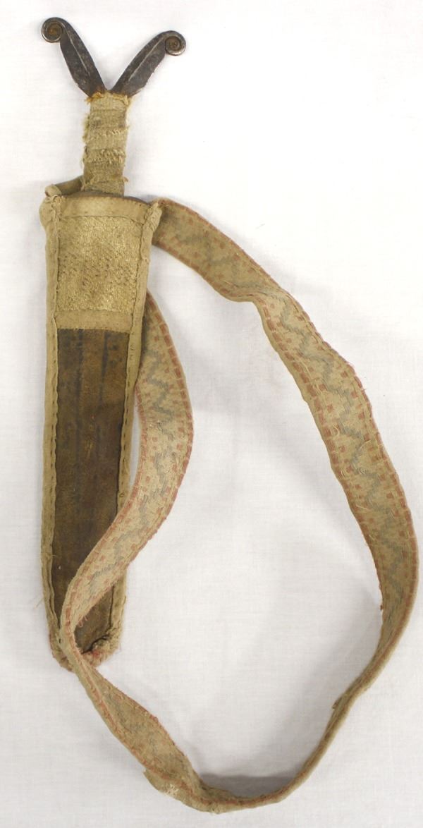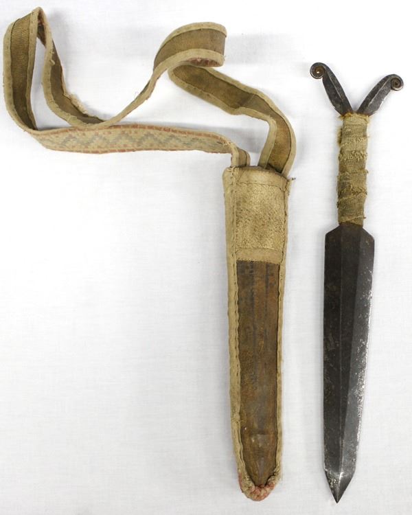 Antique-Vintage Hand Wrought Iron Northwest Coast Athbaskan Dagger, Y Handled, comes in hand crafted sheath, total measurement of 1.5'' x 13'', blade measures 8''L, sheath has a shoulder strap