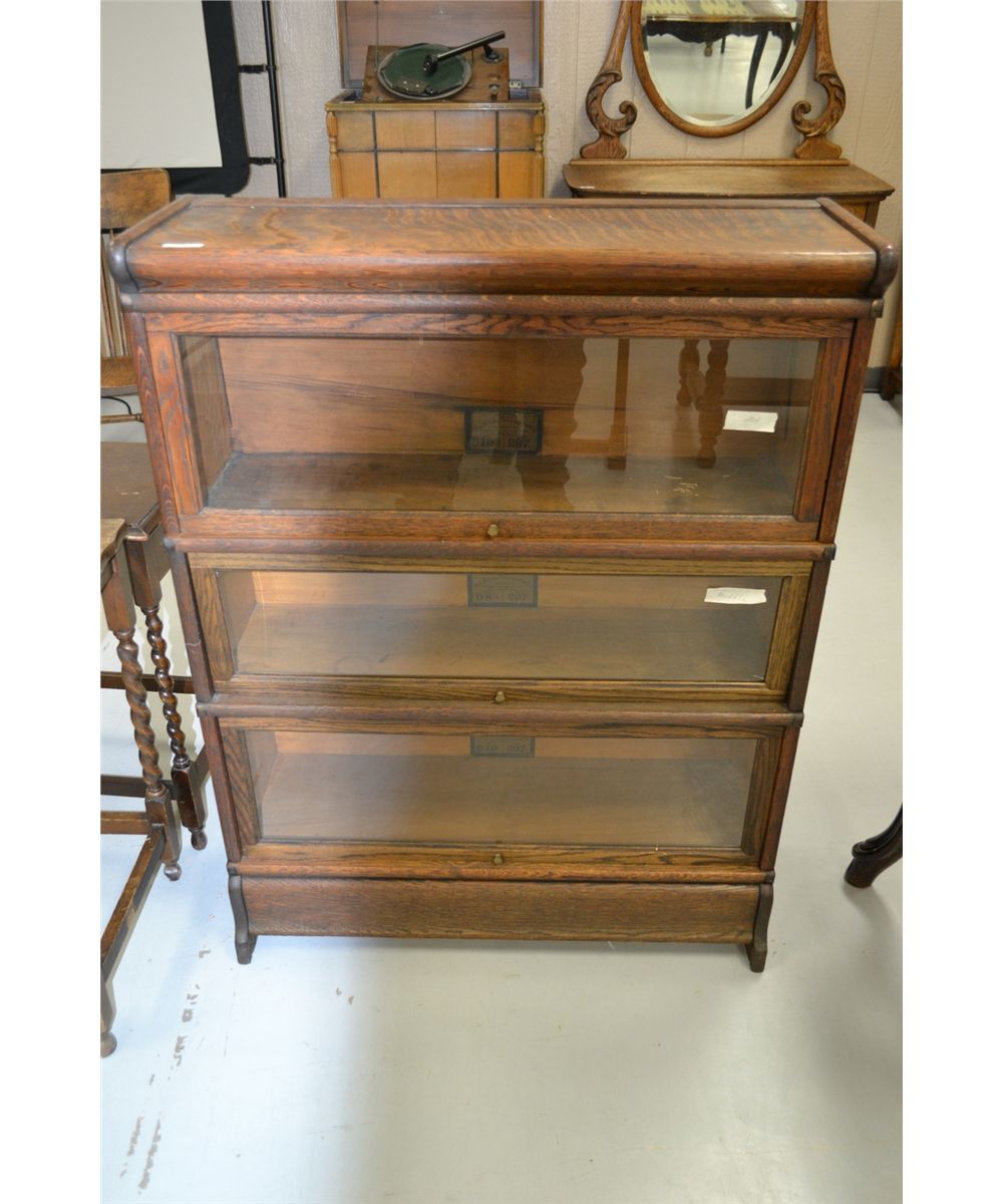 Made by the Globe/Wernicke CO. Cincinnati, OH. Lawers bookcase. 34 in. W, 45 in. T, 12 in. D. 3 glass faced shelves.
