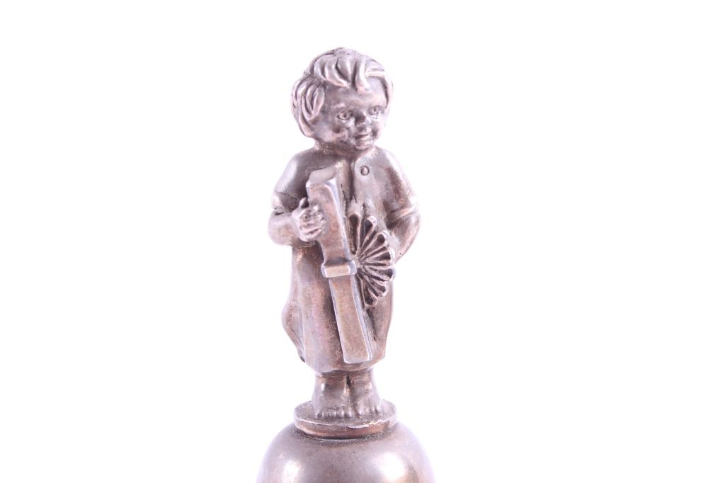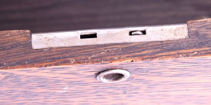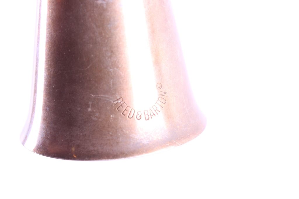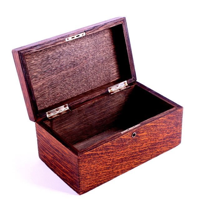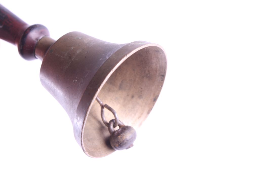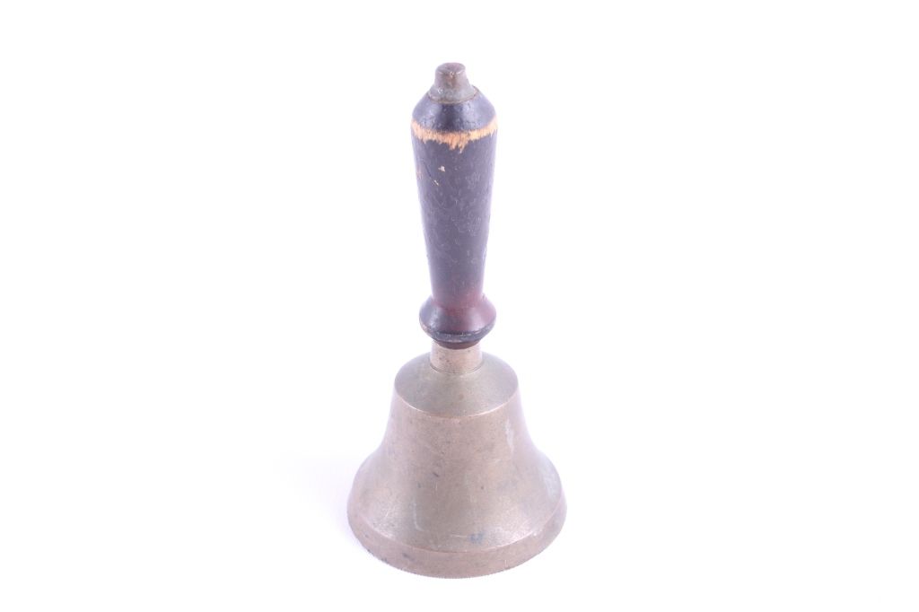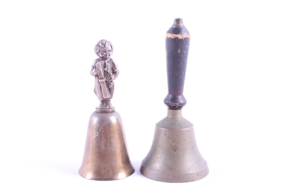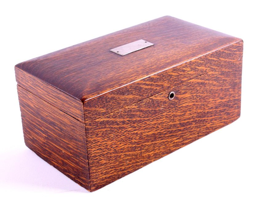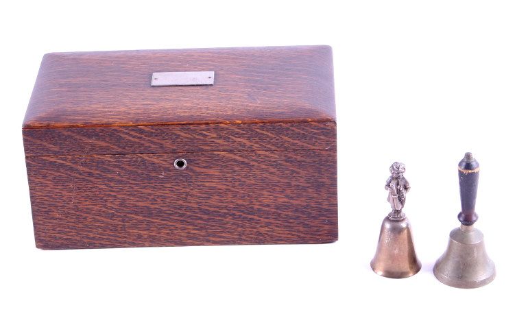This lot includes an antique oak jewelry box and 2 antique bells. The box is made form solid oak. It is hinged and has a lock but no key. The box is in very good condition. It measures 5.5" x 10" and is 4.75" tall. One of the bells is solid brass. The other is marked "REED & BARTON". It is likely silver plate. The bells are in very good condition. The brass bell is 2" in diameter and is 4.5" tall.