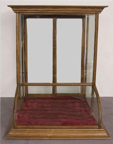 Fabulous Antique Oak Display Case. 34" x 24" wide. Curved glass front with two shelves. Fine condition. (est $750-1,000)