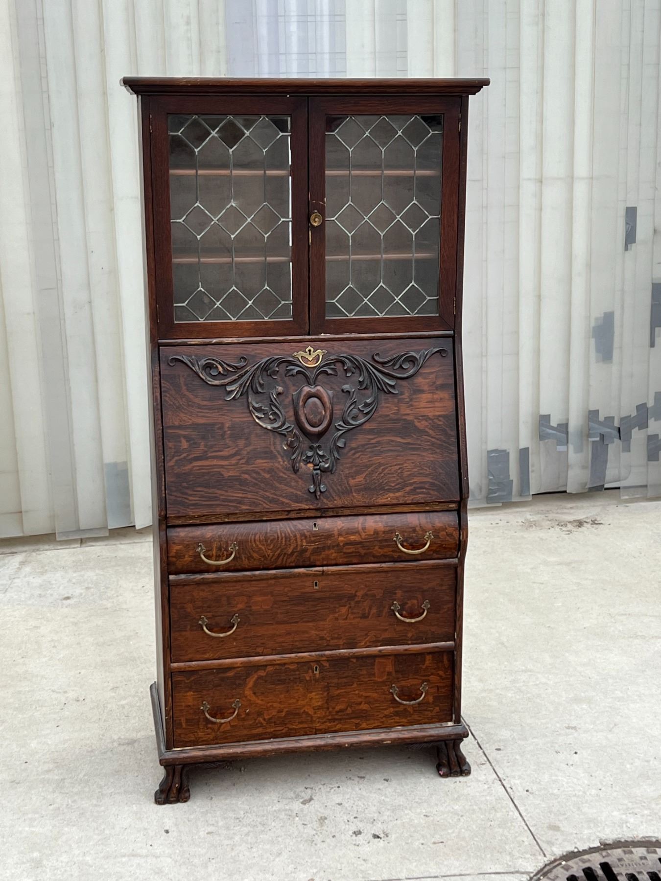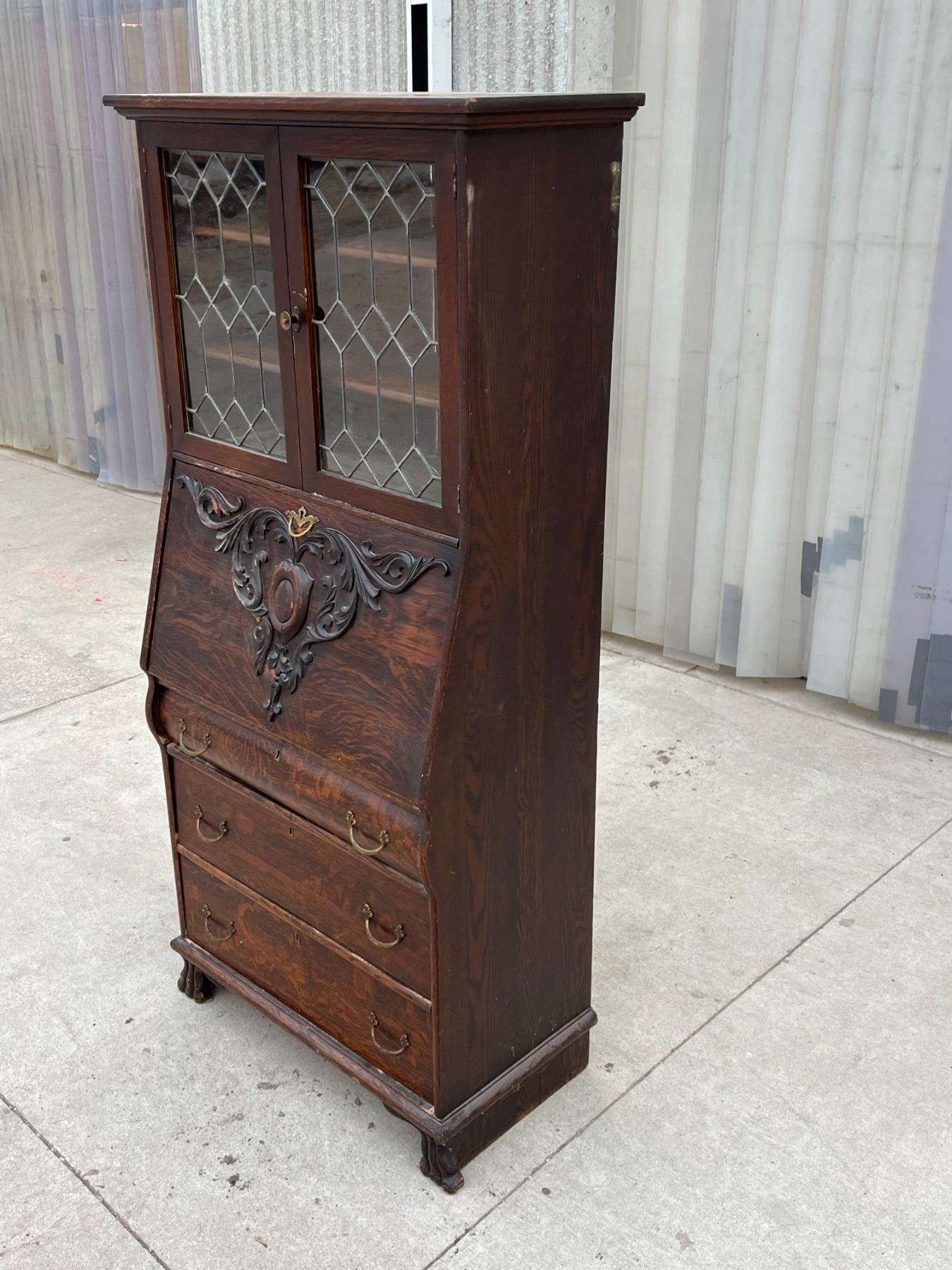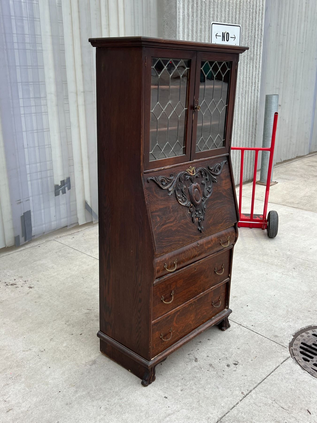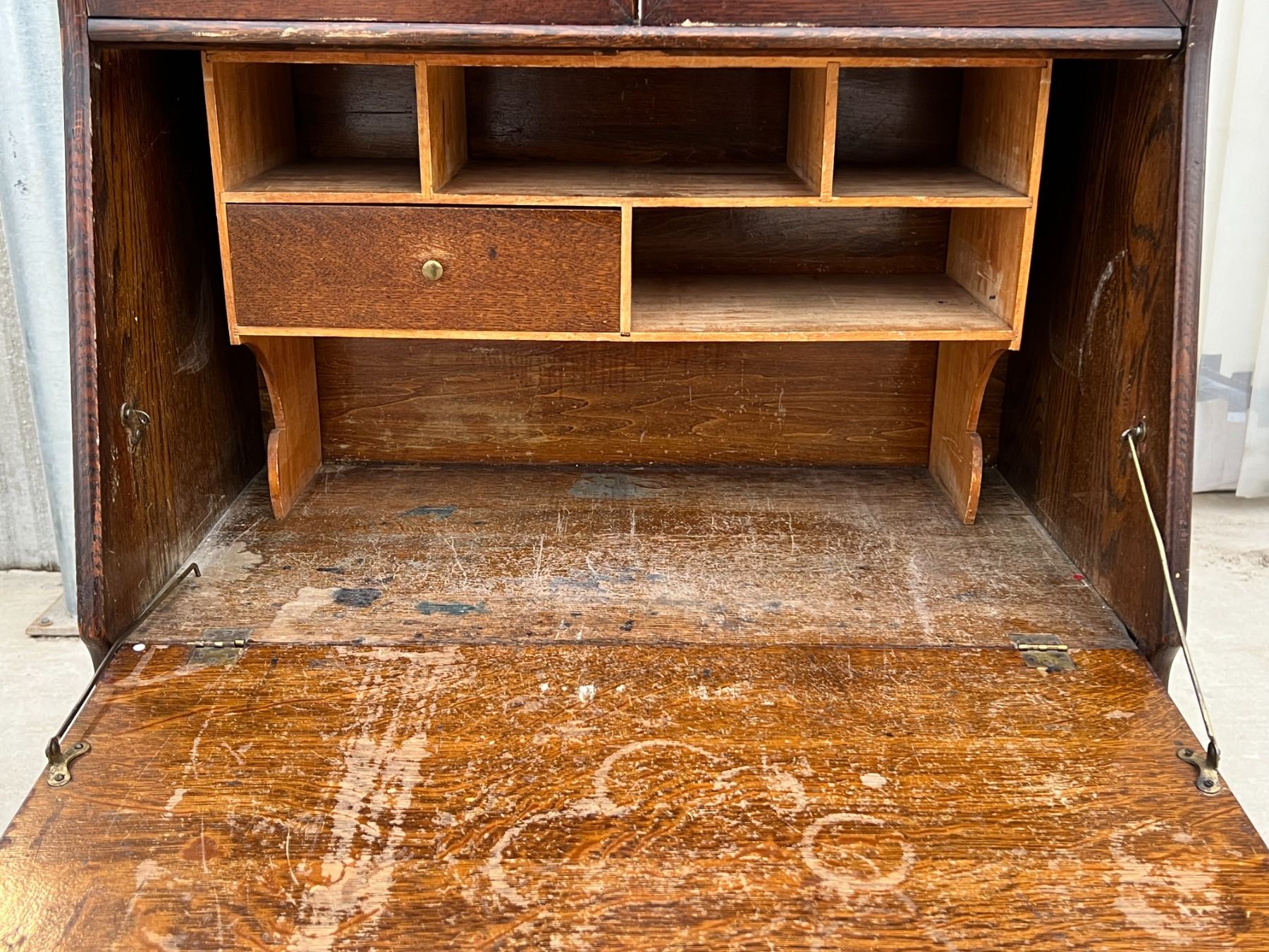 Antique Oak Drop Front Secretary Desk / Cabinet - Approx: 32x16.5" & 67.5"T see all photos