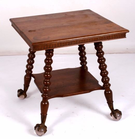 This lot features an antique oak, glass ball in claw feet, parlor table. This parlor table has rare glass ball in brass claws feet on all four legs. Its is held up by the four spindle legs and contains a shelf under the table top. This elegantly designed parlor table is in excellent condition for its age. Glass balls, Measure 3 1/2" diameter. Table Measures: 28 1/2" H x 28 " W 28 " D.