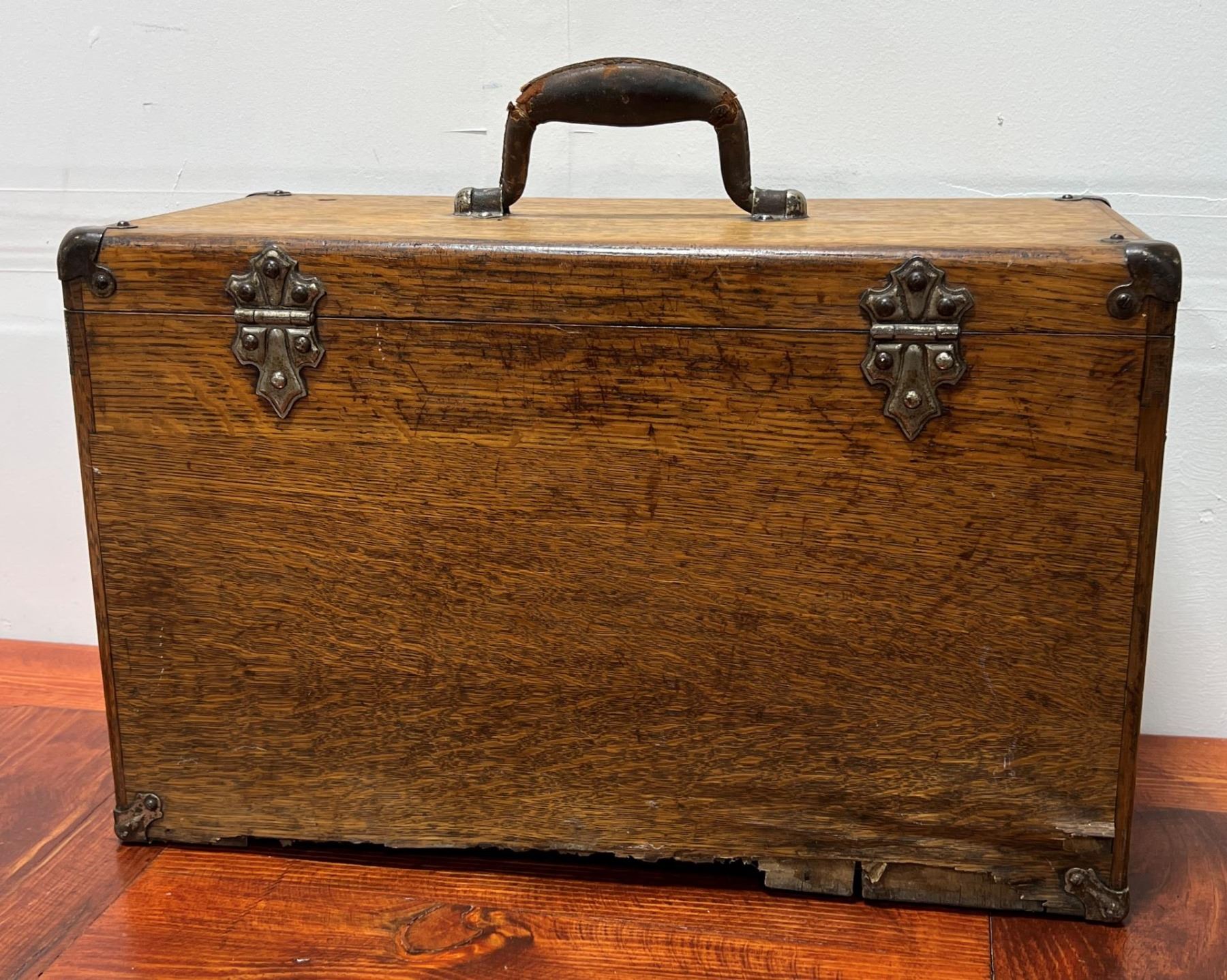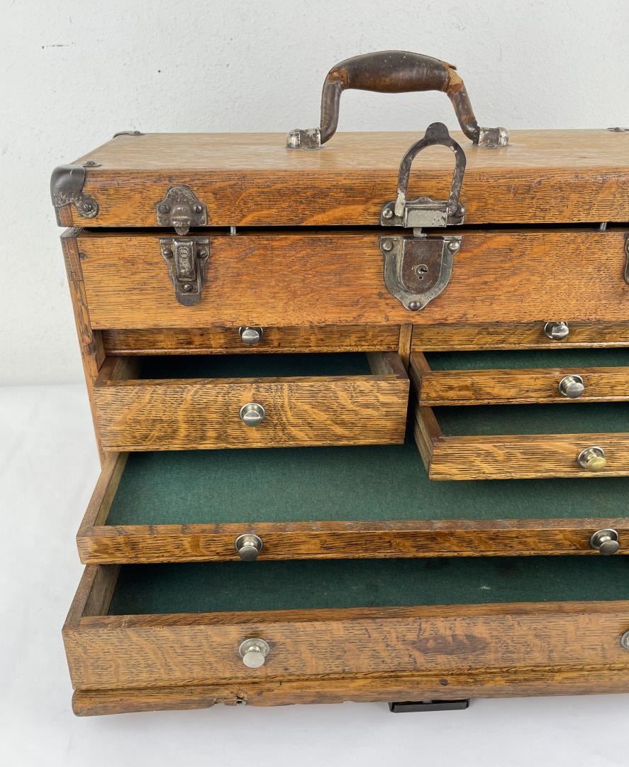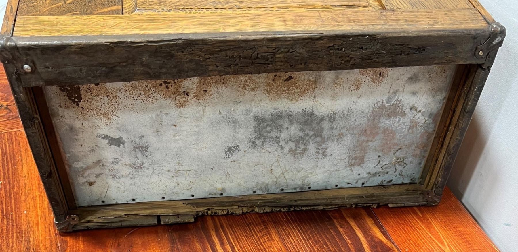 Nice old toolbox. It is missing the bottom board as shown. 12 1/2" tall not including handle, 9 1/2" deep, 20" long.