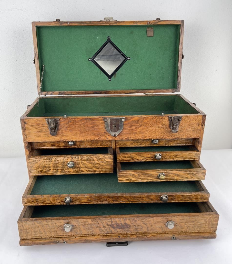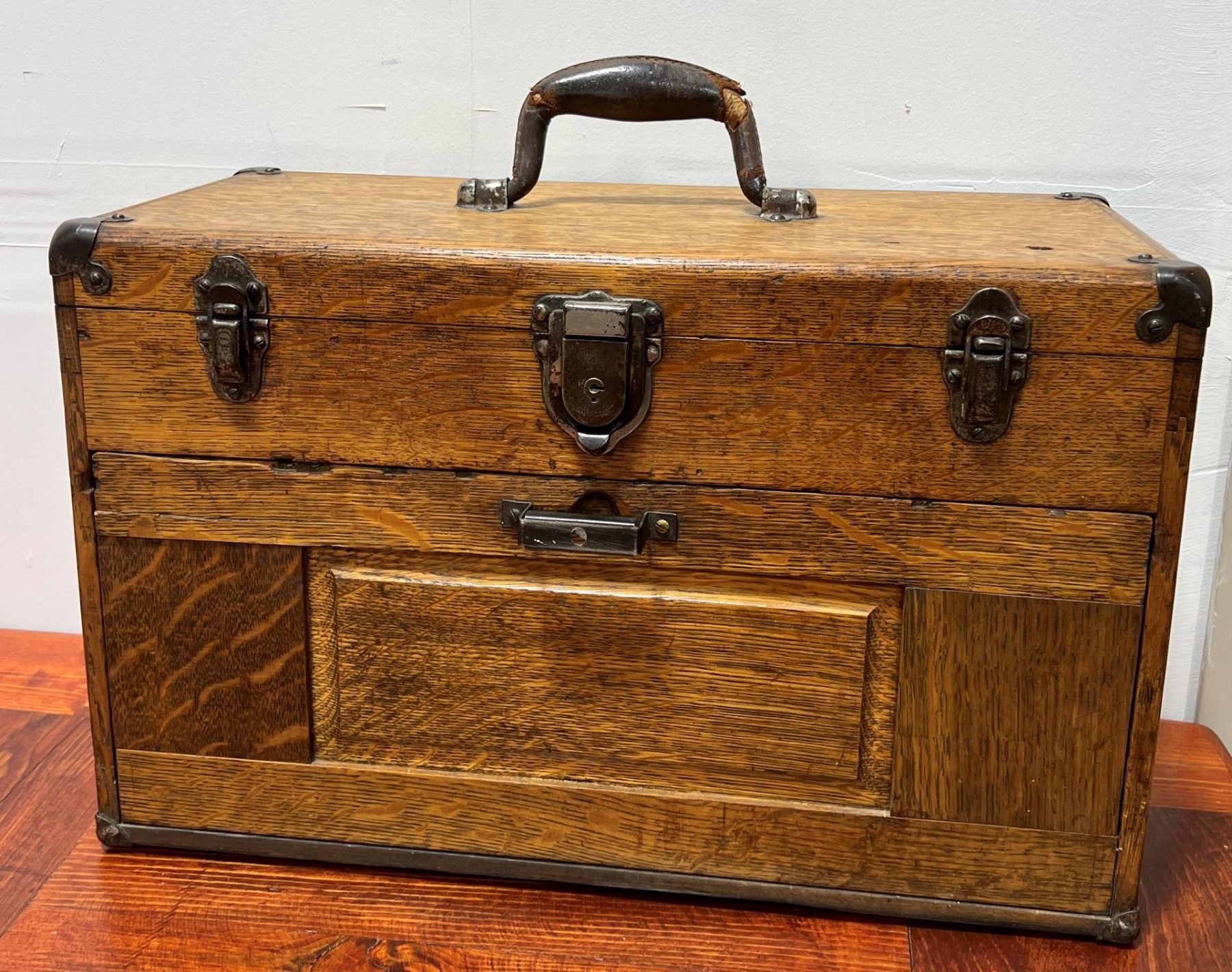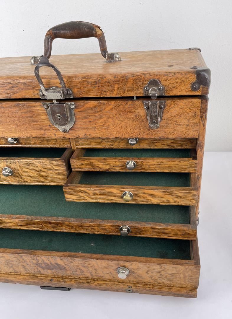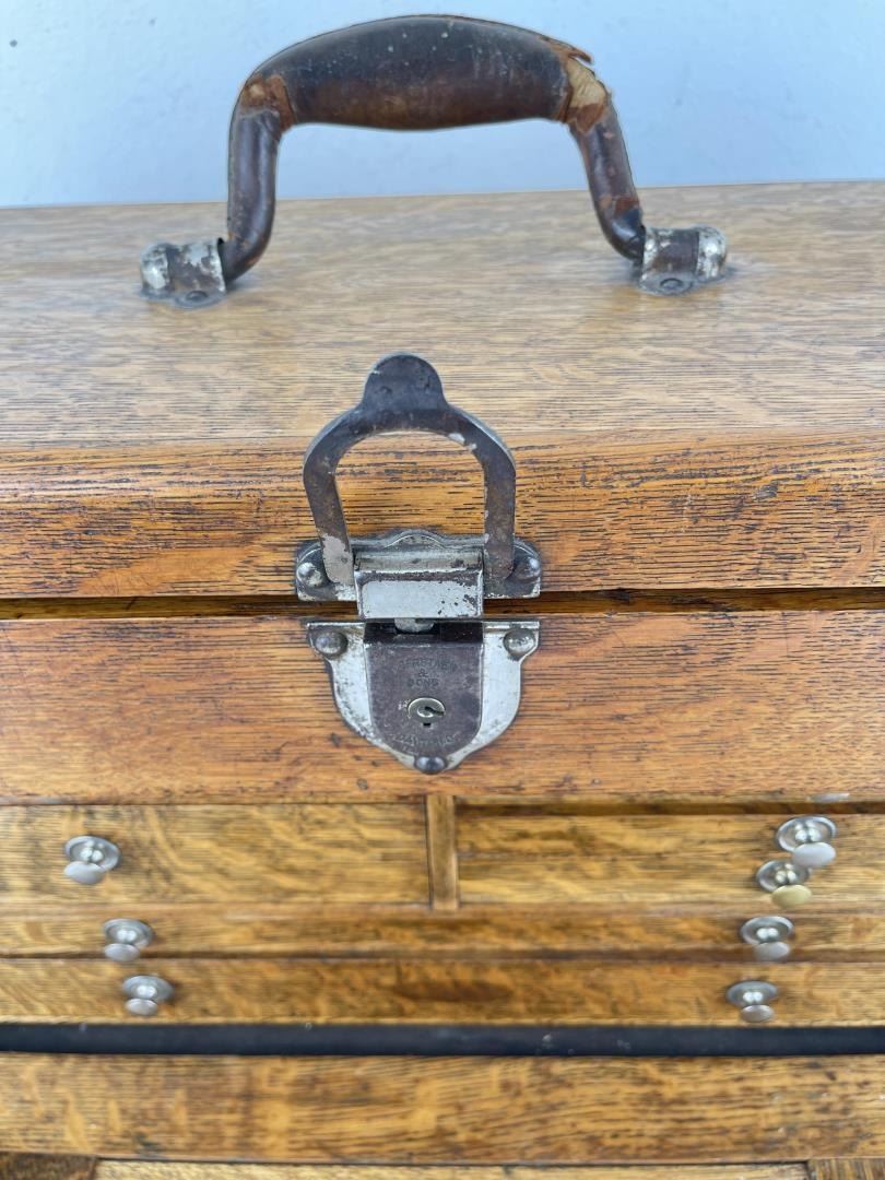 Nice old toolbox. It is missing the bottom board as shown. 12 1/2" tall not including handle, 9 1/2" deep, 20" long.