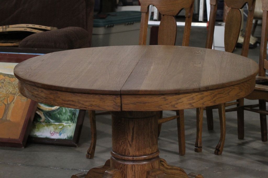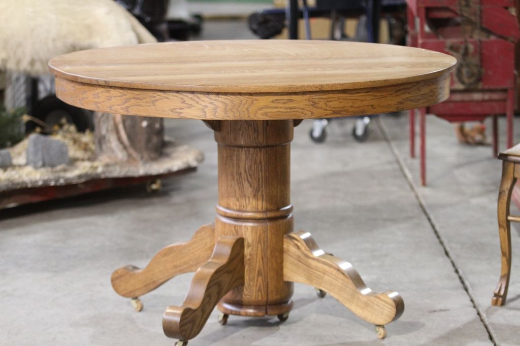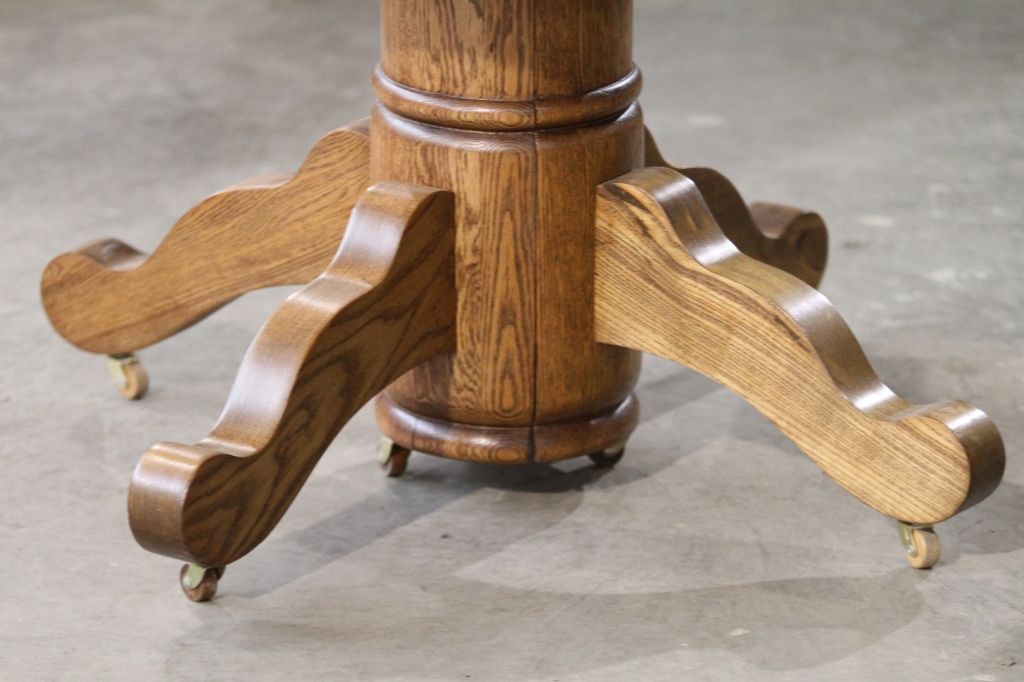 Antique Oak Round Table This is in excellent condition. This is on casters and also the base splits for easy breakdown and travel.