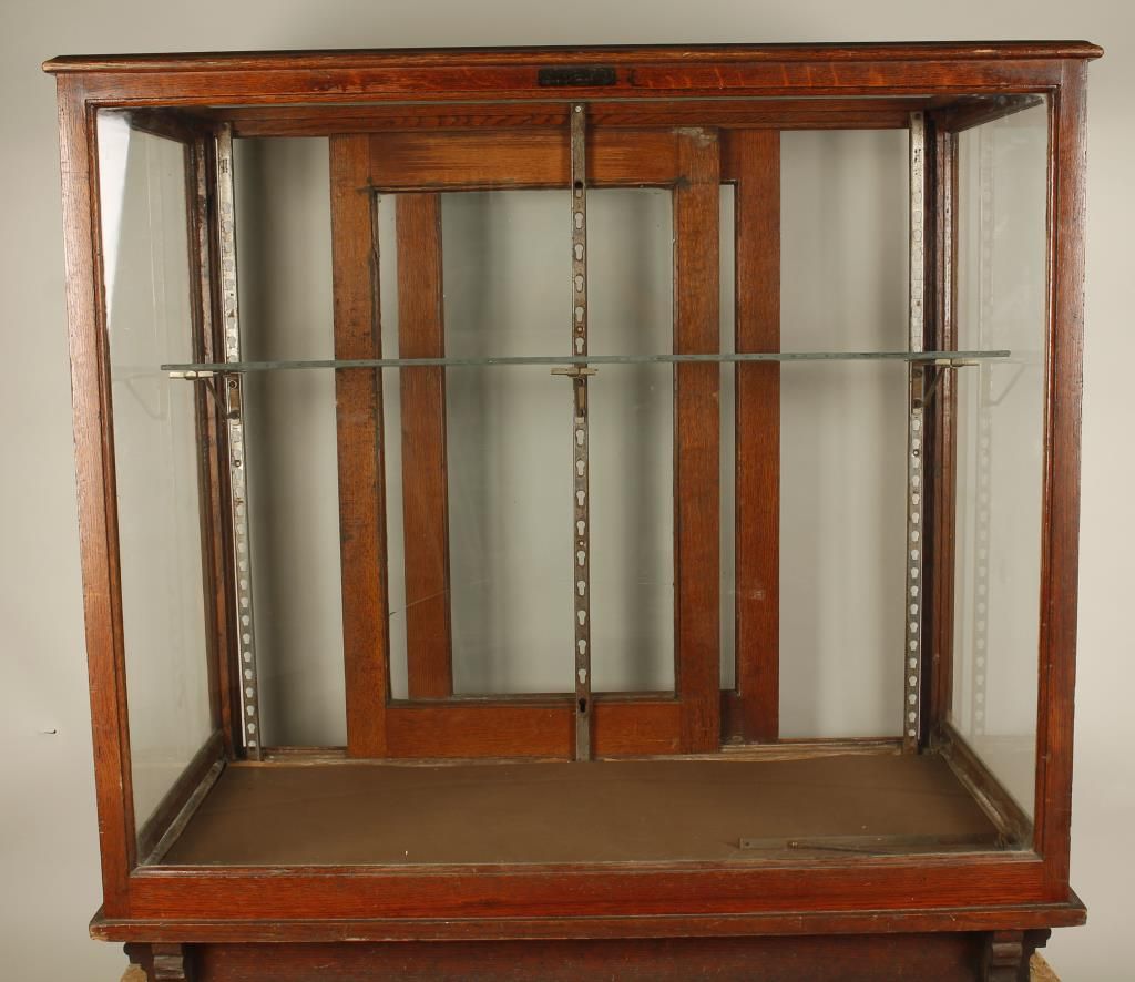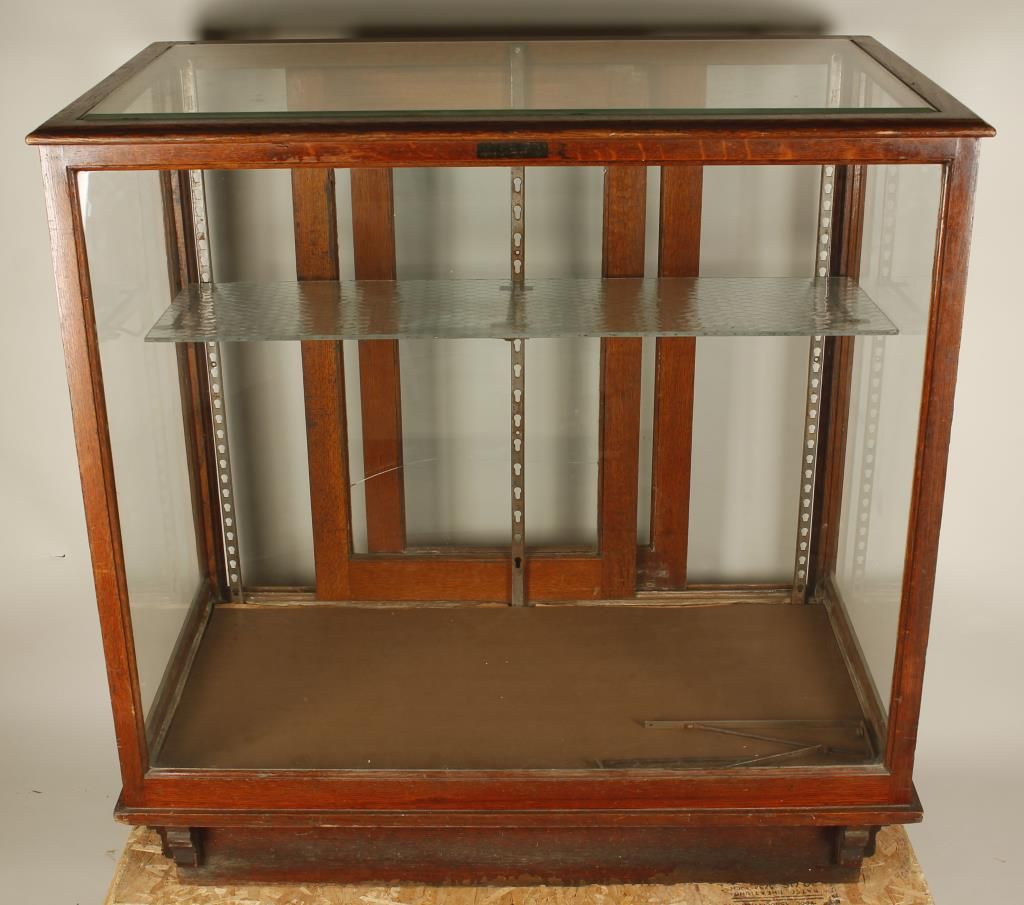 42" high, 42" wide, 24" deep. Two shelves. One of the glass doors is cracked.