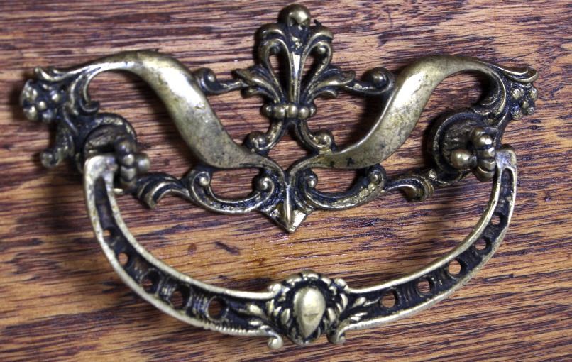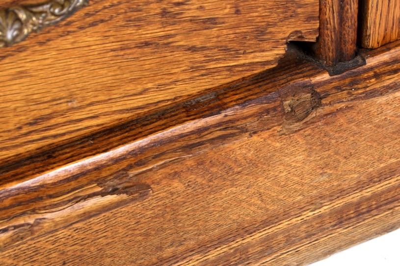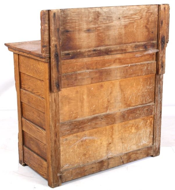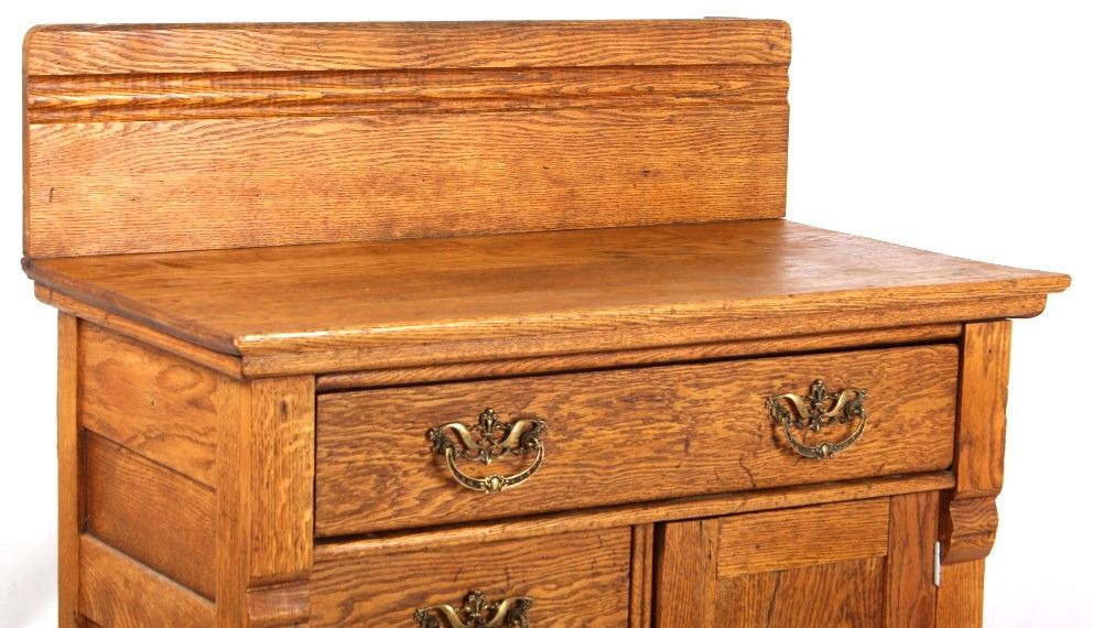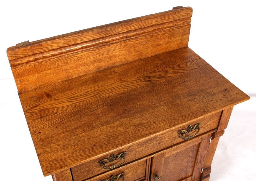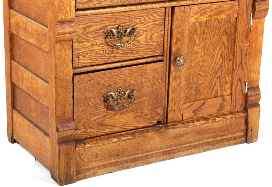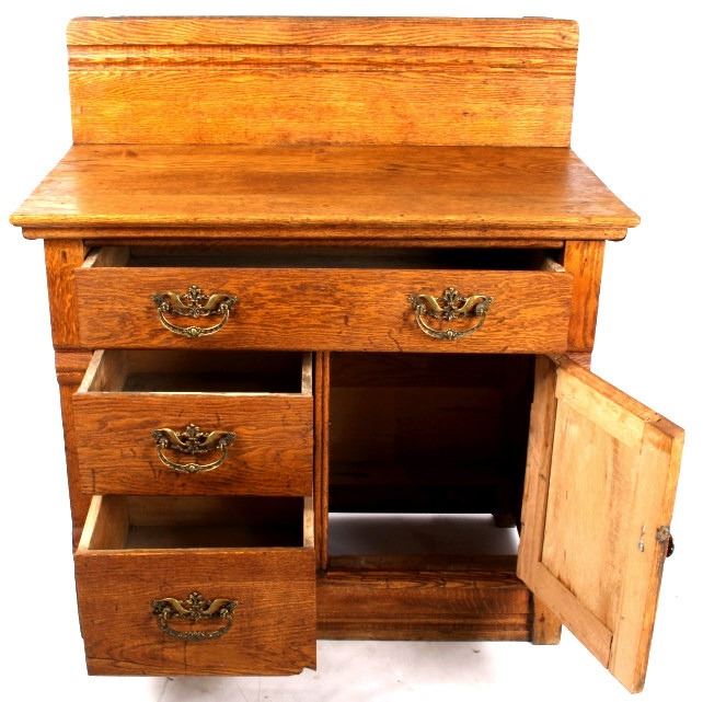 This is an antique oak wash stand. The wash stand features three drawers and a door that opens for additional storage. The wash stand also has a wooden back splash. The wash stand is in good condition for its age, there is a crack in the wood on the top, the bottom on the door side is missing, and there are some damage to the front(see photos). It measures 32 1/4" W x 36" H x 18 1/2" D