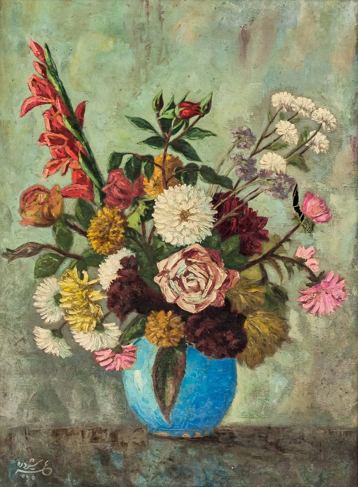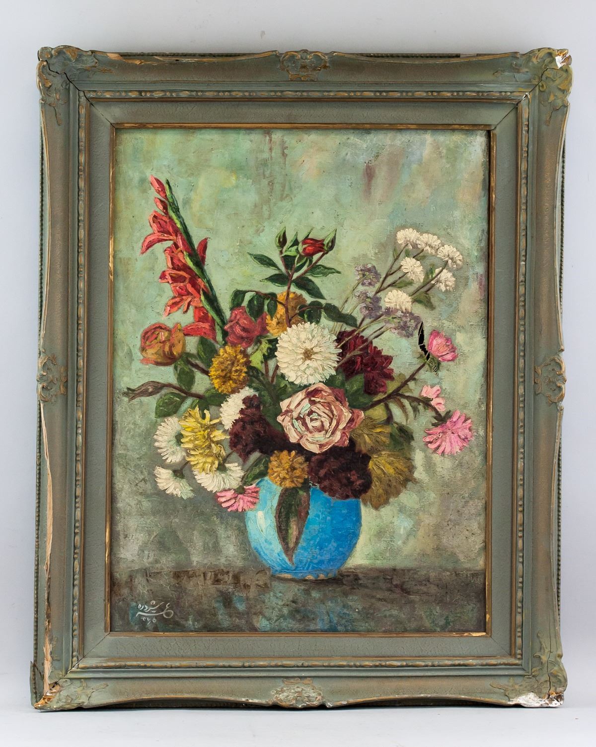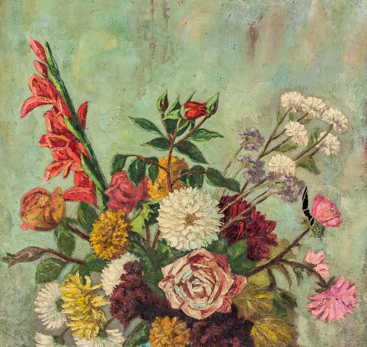 Antique oil on canvas, framed. Featuring bouquet of flowers in a round blue vase. Signed in illegibly in bottom left corner. 60 x 64 cm, 77 x 62 cm