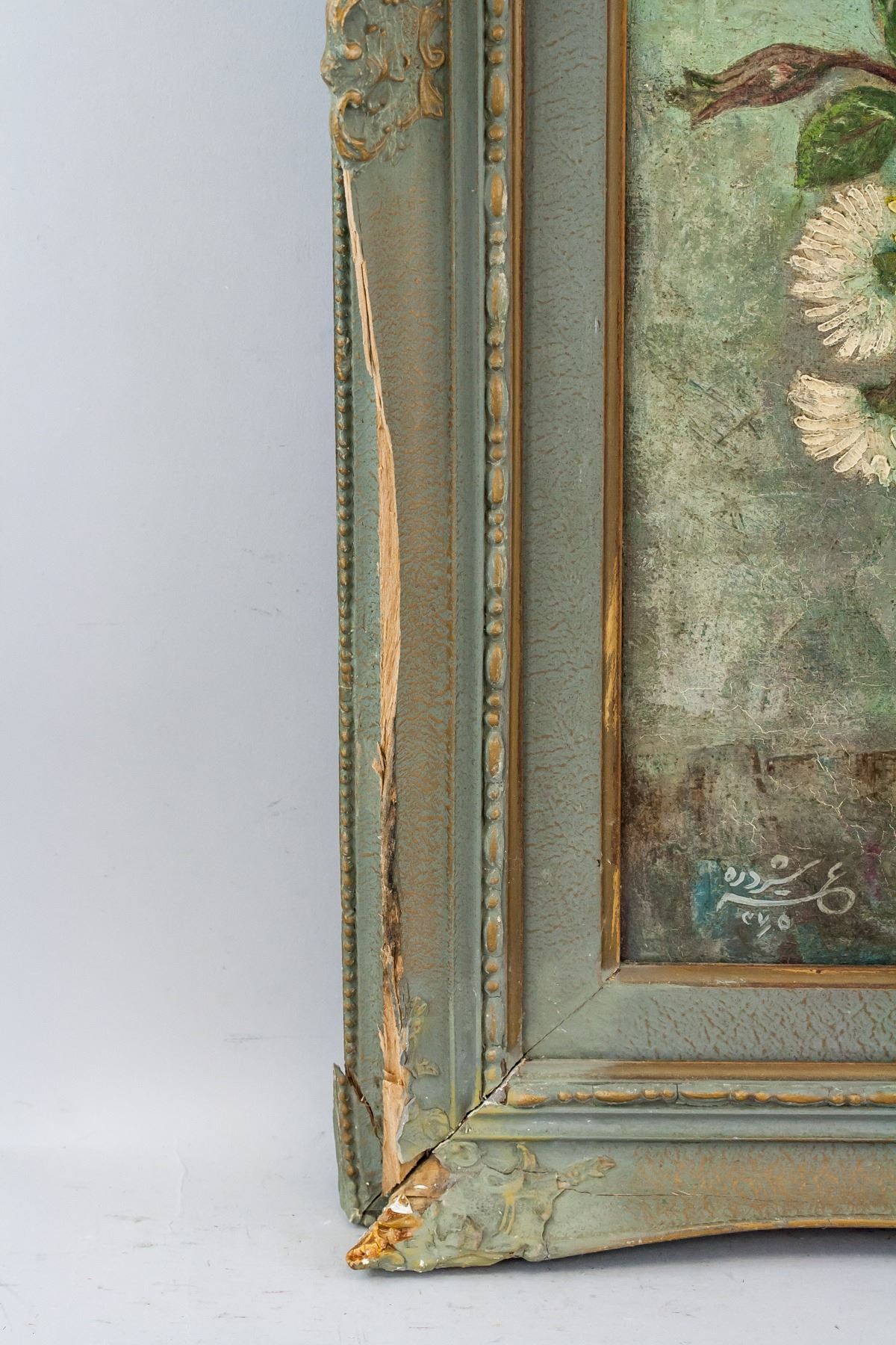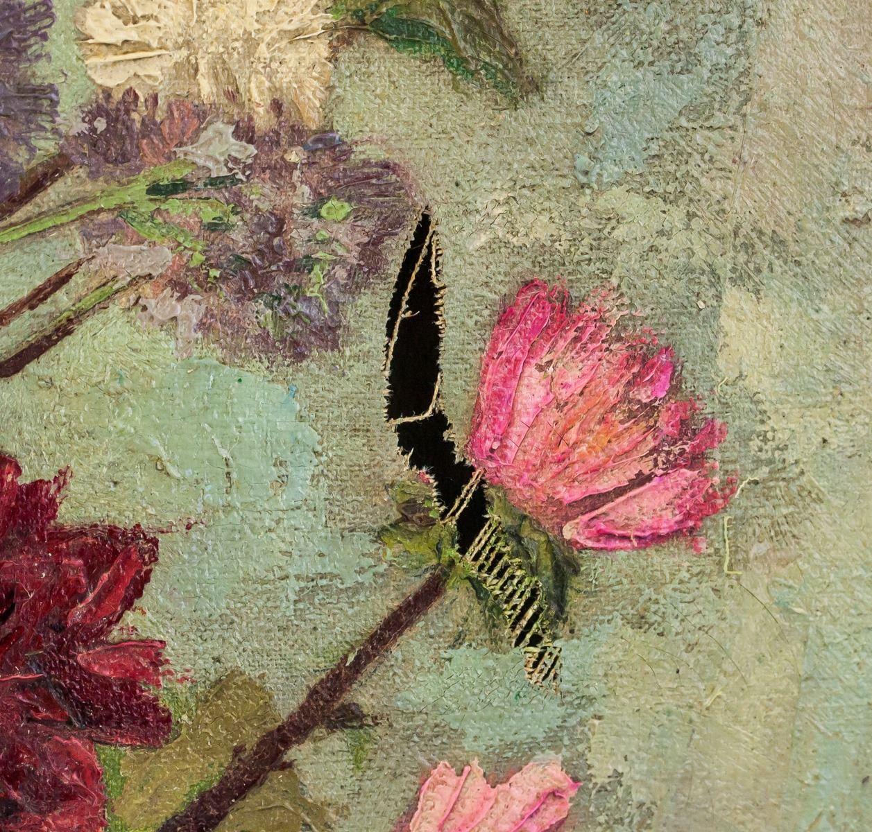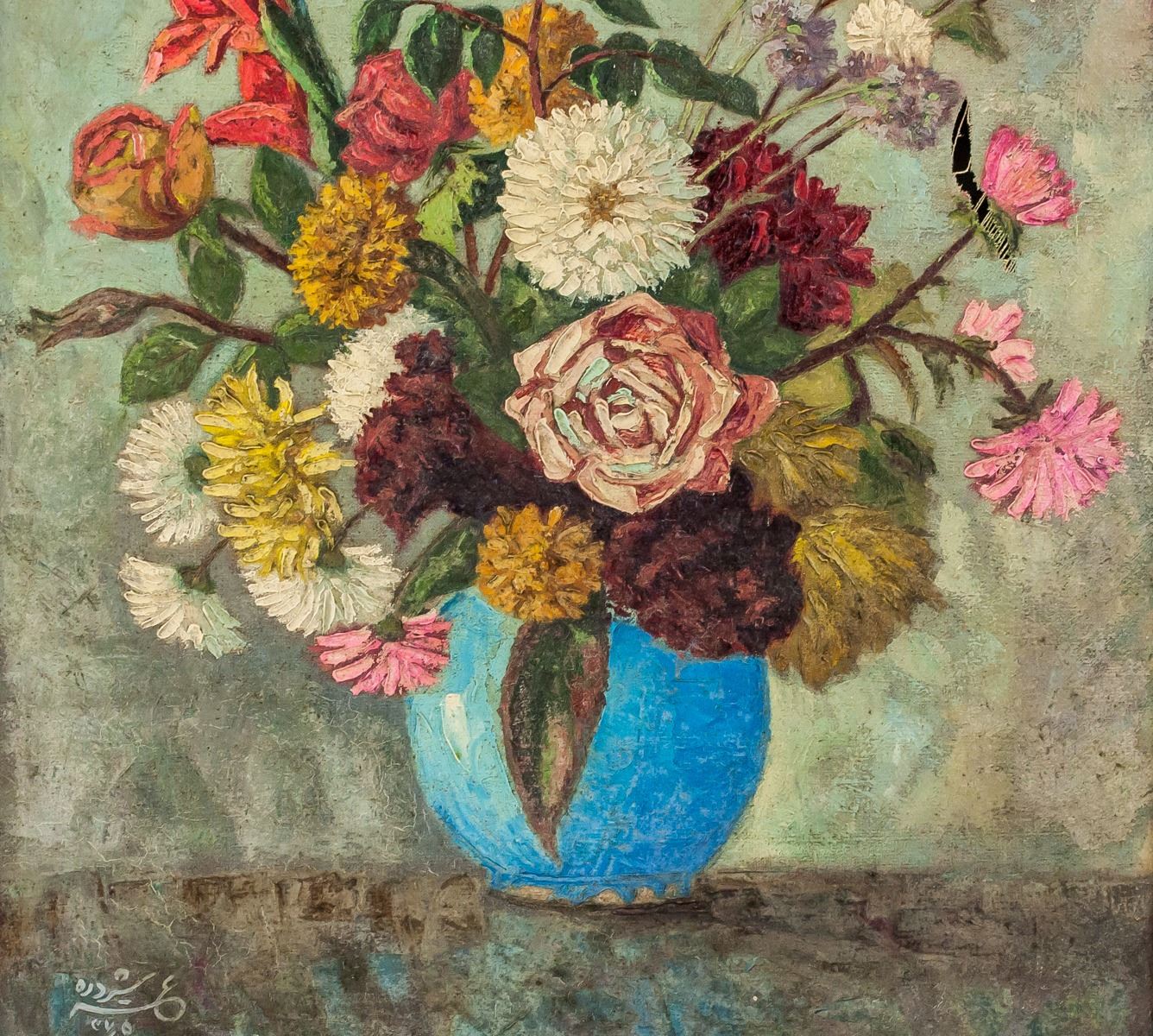 Antique oil on canvas, framed. Featuring bouquet of flowers in a round blue vase. Signed in illegibly in bottom left corner. 60 x 64 cm, 77 x 62 cm