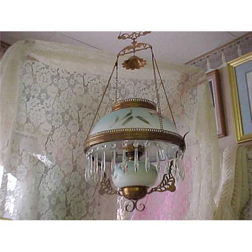 Just as beautiful and functional as the day it was made. This oil/kerosene chandelier belies its more than 110 years! Soft pinks and greens are complimented by the copper frame and perfectly preserved leaded crystal prisms. Also comes with the copper ceiling mount. A treasure!