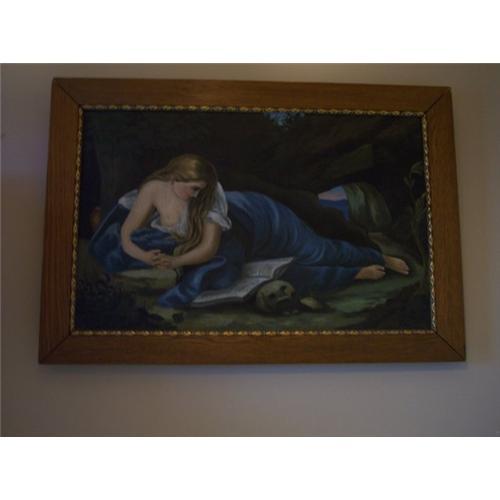 This is the other unusual oil painting I purchased at the same time I bought the previous one.This one is on canvas and framed in a very nice oak frame.It is not signed as far as I can tell.I had a lady tell me that the name of this painting is something like-"Reading From the Book of Souls".I do not know for sure but it is a different type of painting.Measures 32 1/2" x 22 1/4".Very good condition.