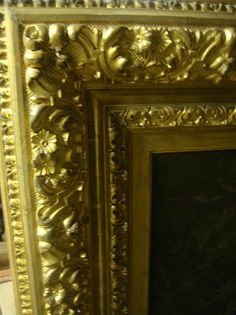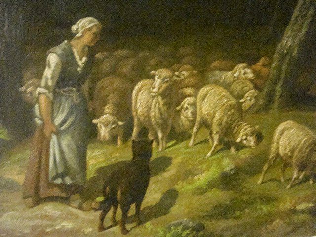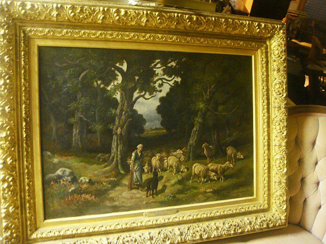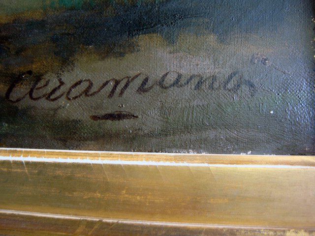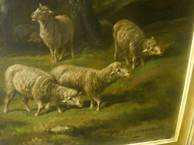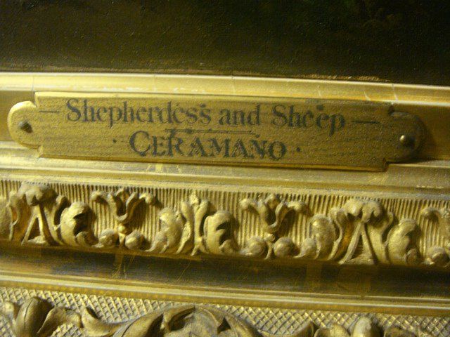 Antique Oil Painting by Ceramano, "Shepherdess and Sheep" with Gorgeous Original Ornate Gold Gilt Frame. Belgian painter Charles Ferdinand Ceramano, 1829-1909, signature in lower right hand corner of painting. Frame Size measures 18 inches wide x 39 1/2 inches tall.