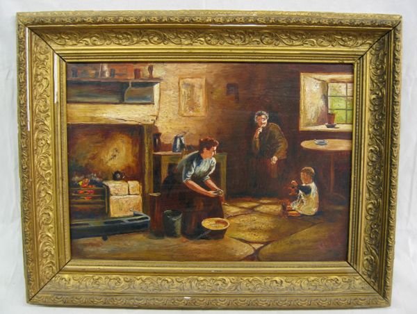 Antique Oil Painting on Board by W. Aldows. This piece is framed and depicts a family enjoying every day life. It has a visual measurement of approx. 11''H x 16''W.