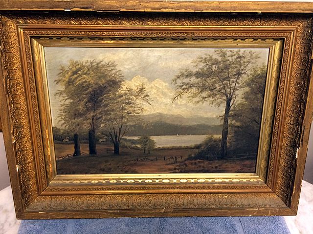 Well over 100 years old antique oil painting of landscape with lake and sailboats, moutains in background. Comes with antique gold gilt frame. This painting was attic stored and is being offered just the way we found them. Very nice painting for anyone who loves nautical / landscape themes.