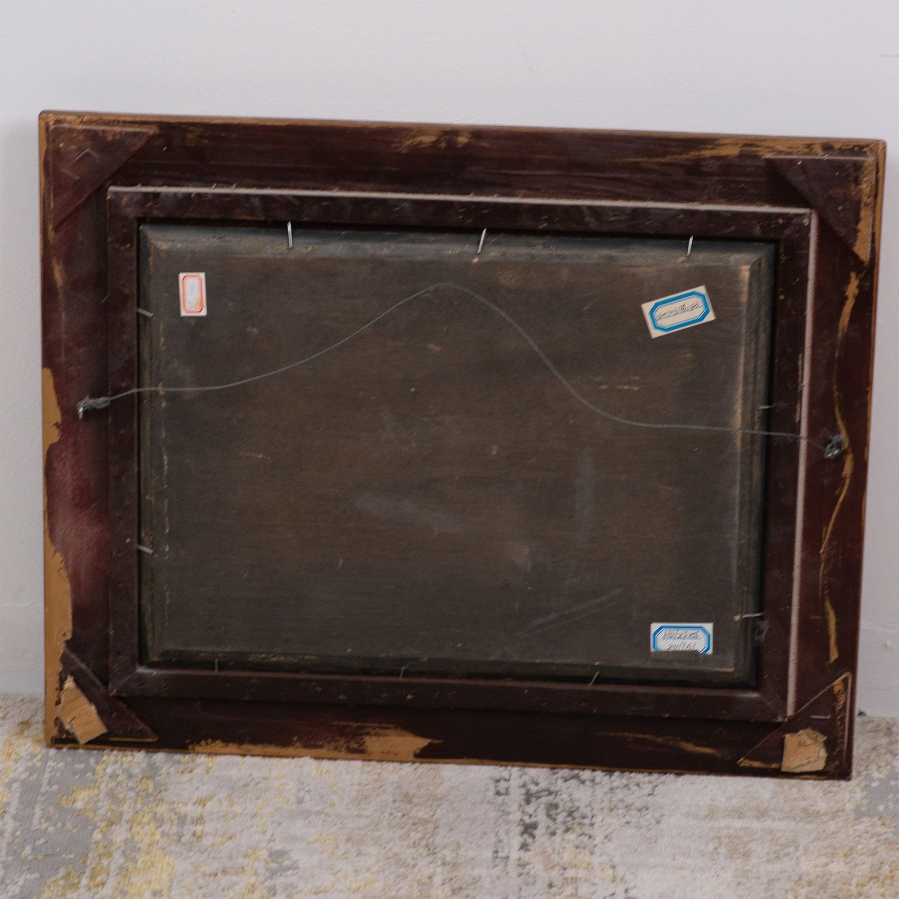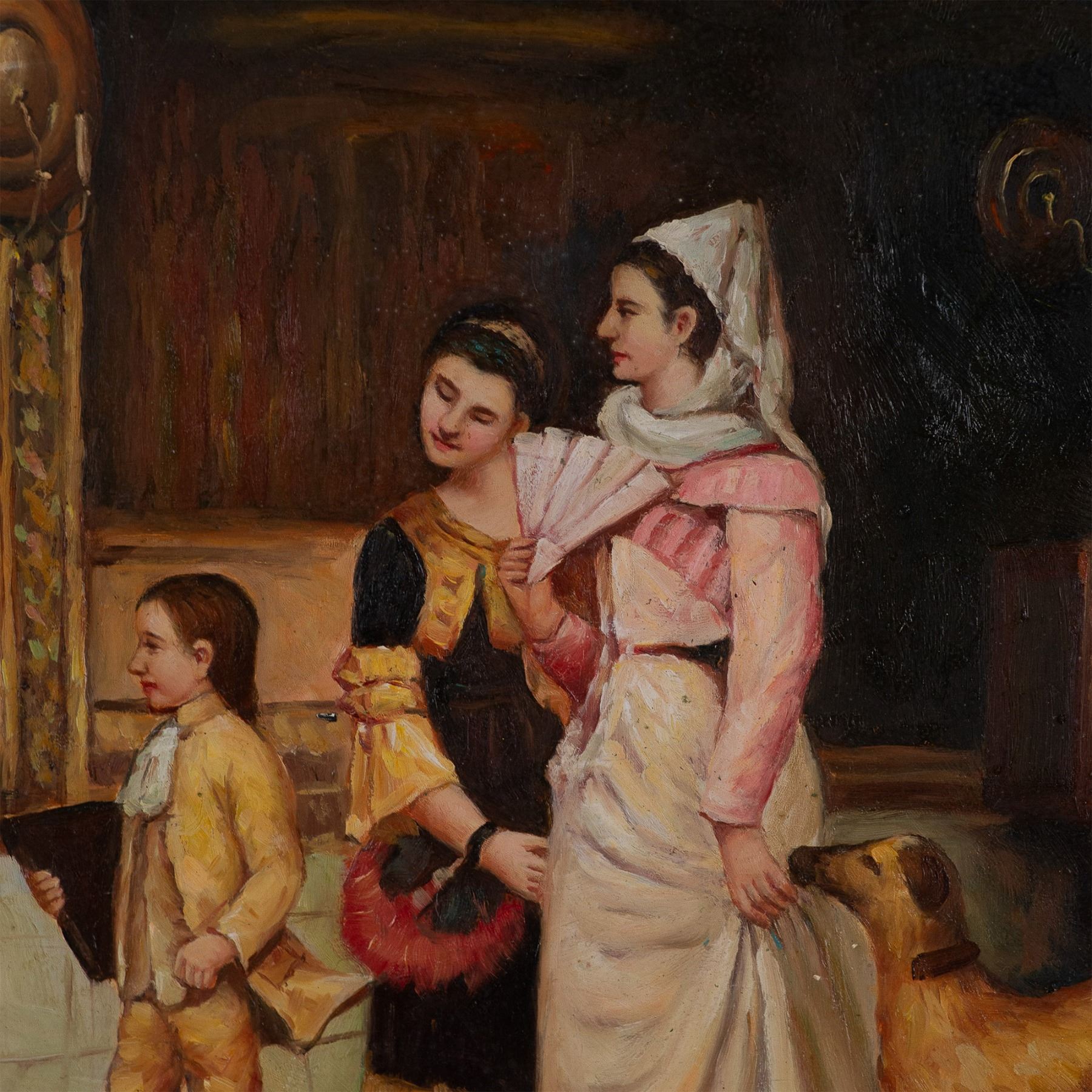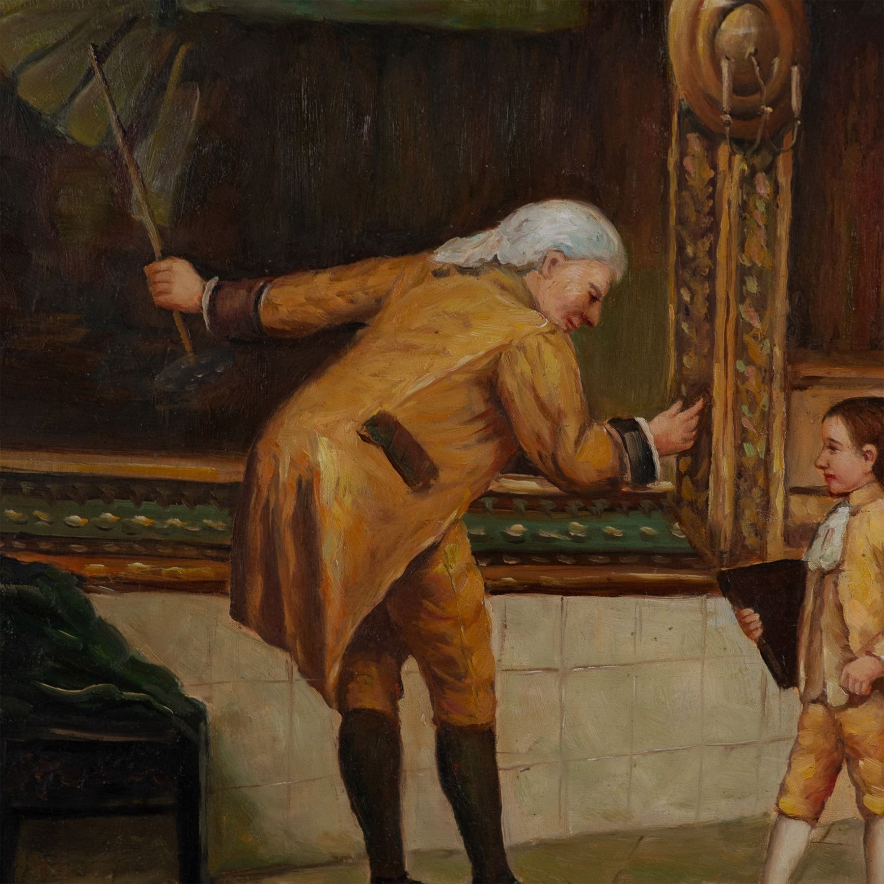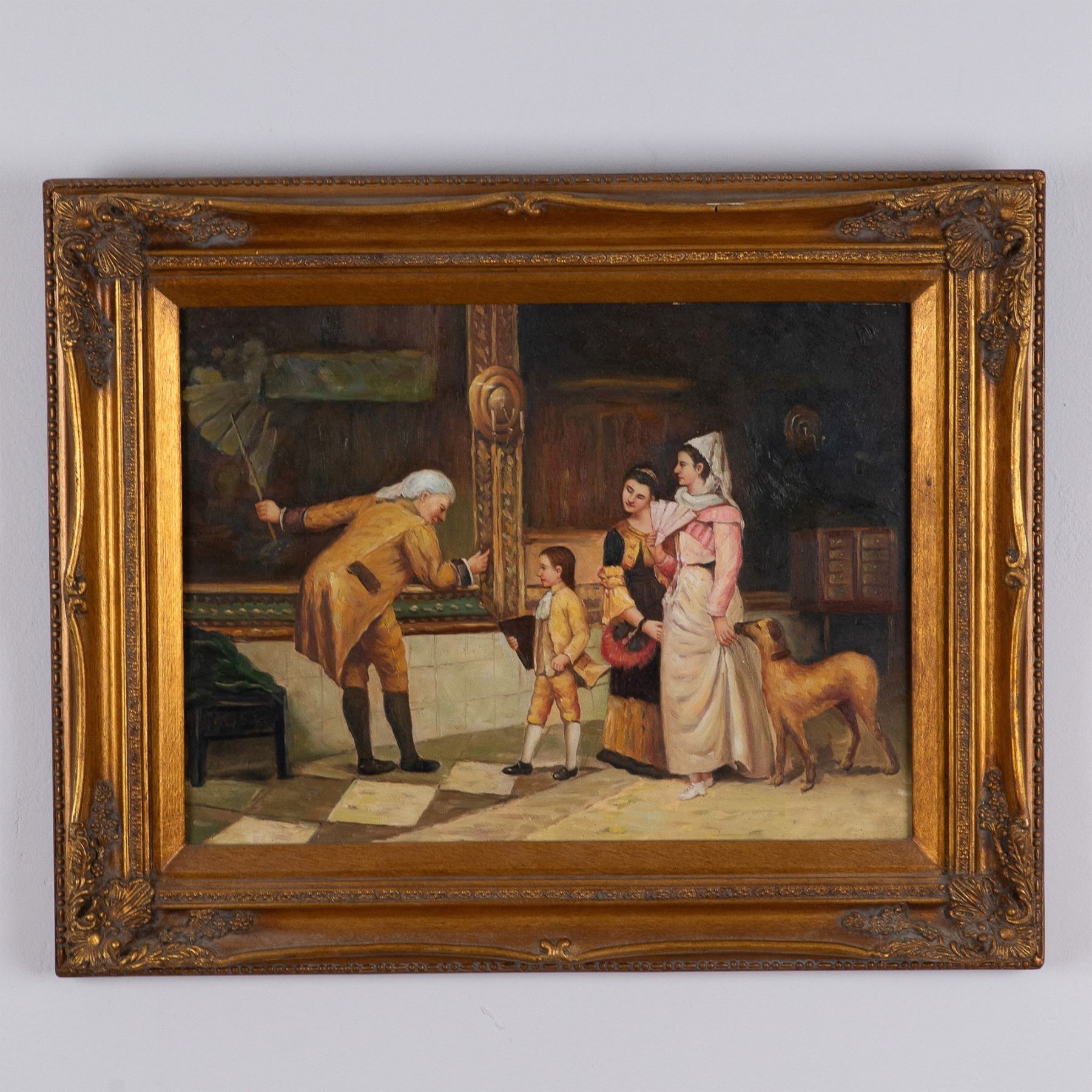 This charming oil on board painting captures a delightful 18th-century style genre scene. The composition depicts a gentleman in period attire engaging warmly in a lesson with a young boy holding a book, while two women, dressed in elegant gowns, observe with smiles. A faithful dog stands beside them, completing the idyllic tableau. The scene is set within an opulent interior, with intricate architectural details, polished tile flooring, and finely rendered furniture lending depth and sophistication to the composition. The artist masterfully conveys the rich textures of the characters' clothing, the luminous sheen of the tiled floor, and the warmth of the moment. The vibrant yet balanced color palette adds to the painting's timeless appeal. Artwork dimensions: 15.50"L x 11.50"H. Frame dimensions: 21.25"L x 17"H x 1.50"W.