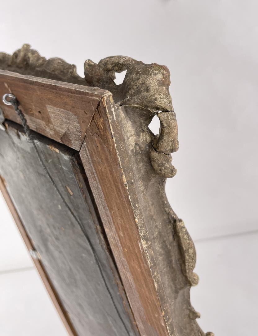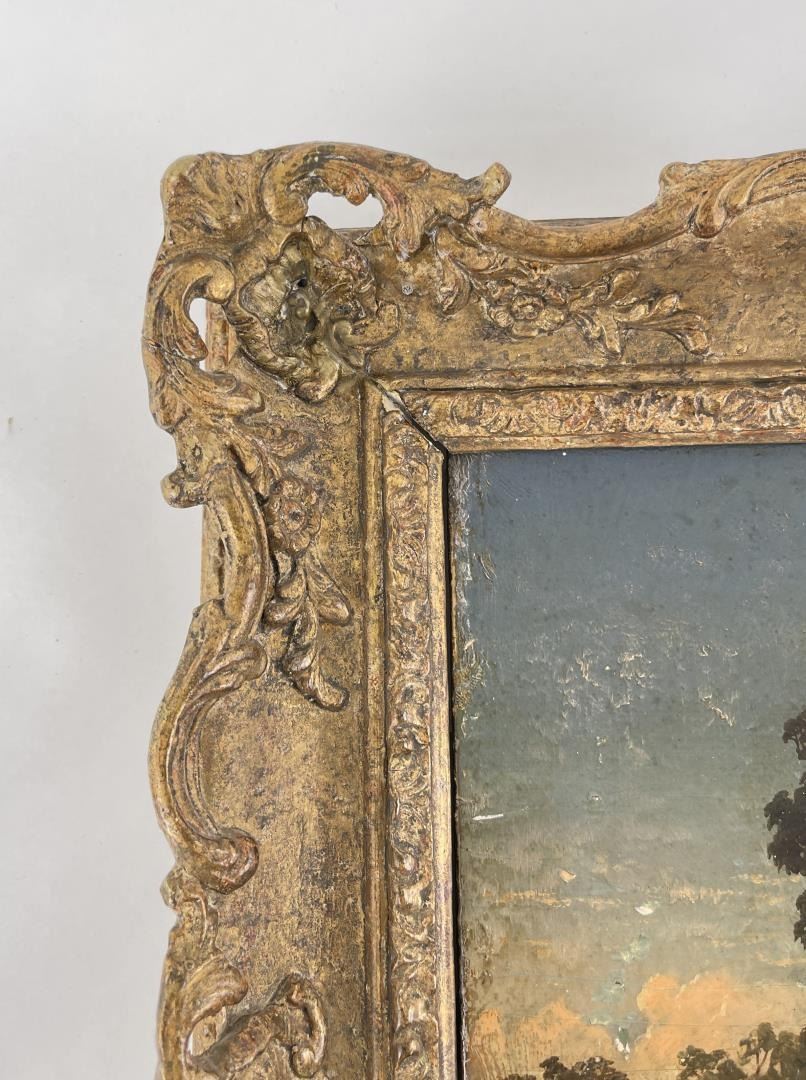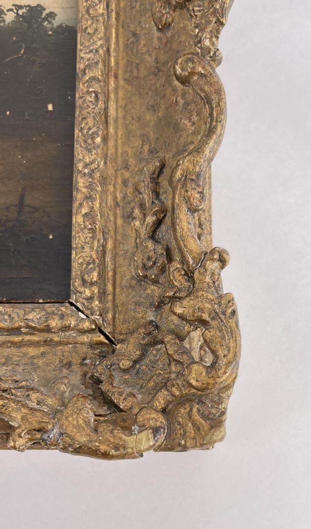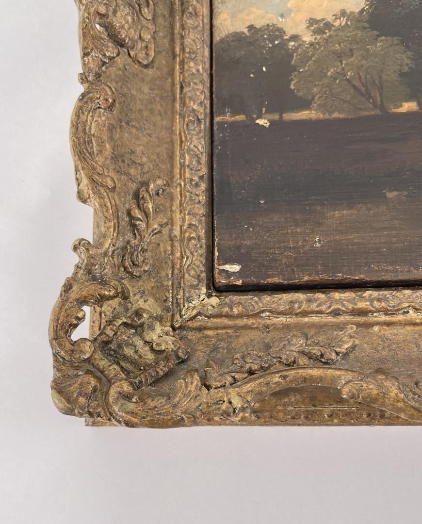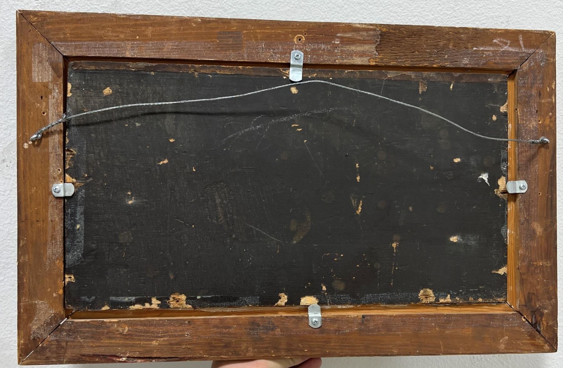14" by 22 1/2" framed. Oil on board. Unsigned. Frame was damaged and repaired.