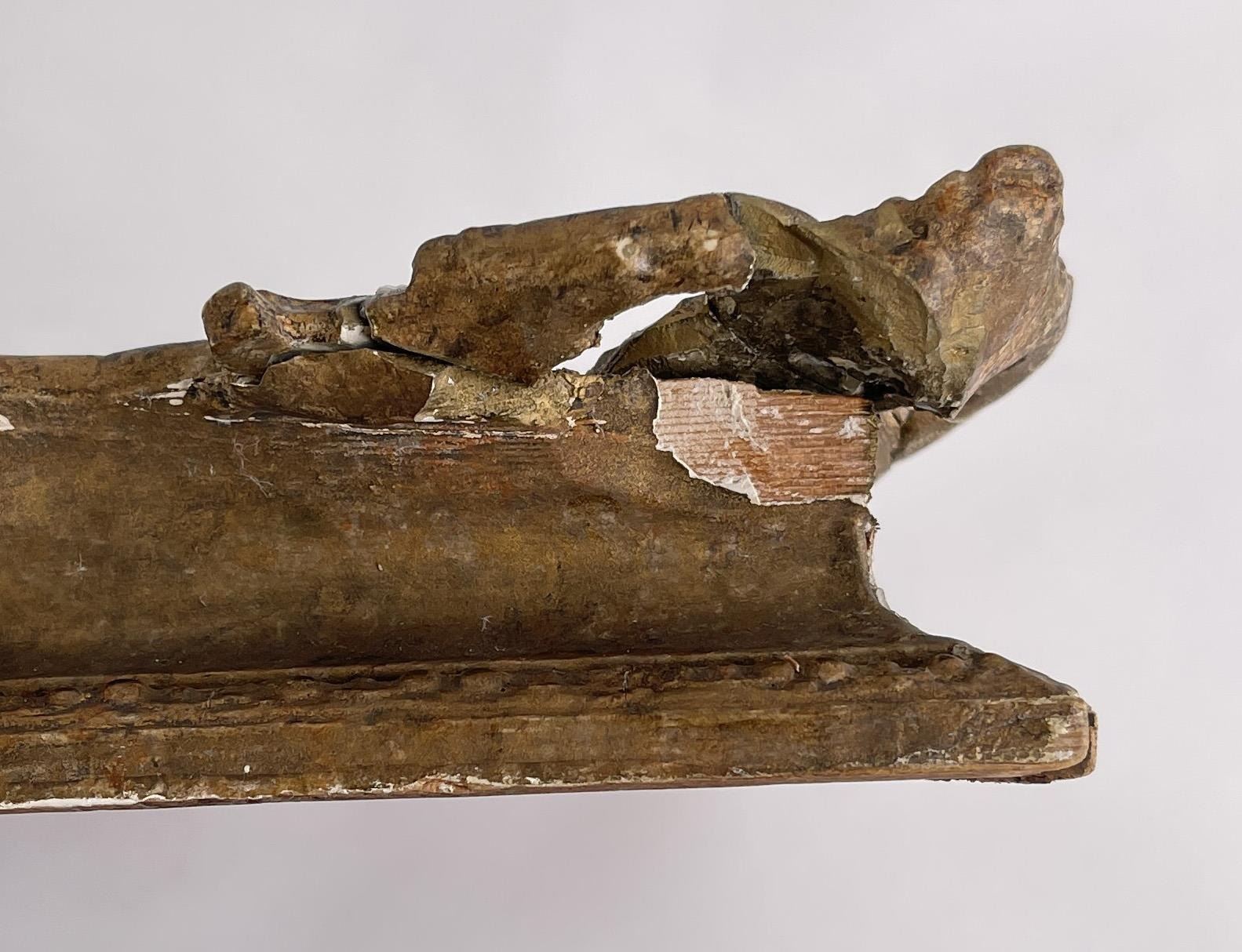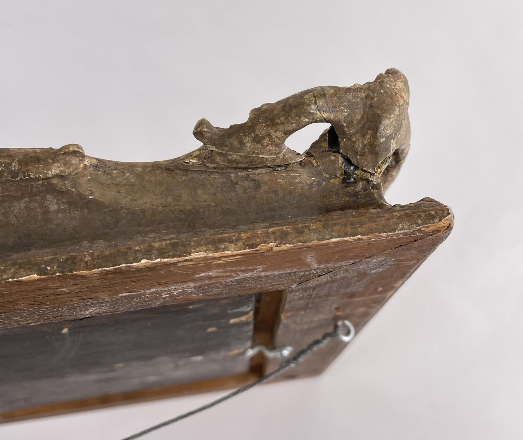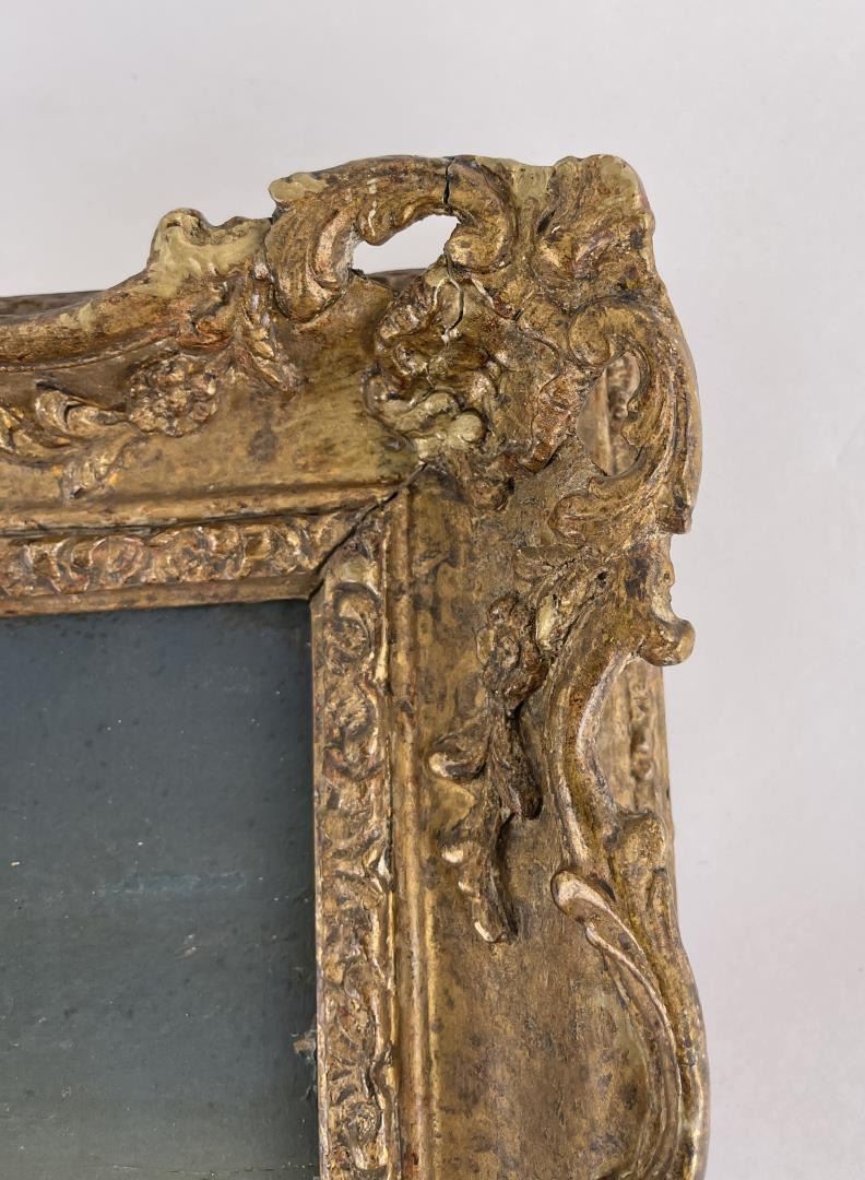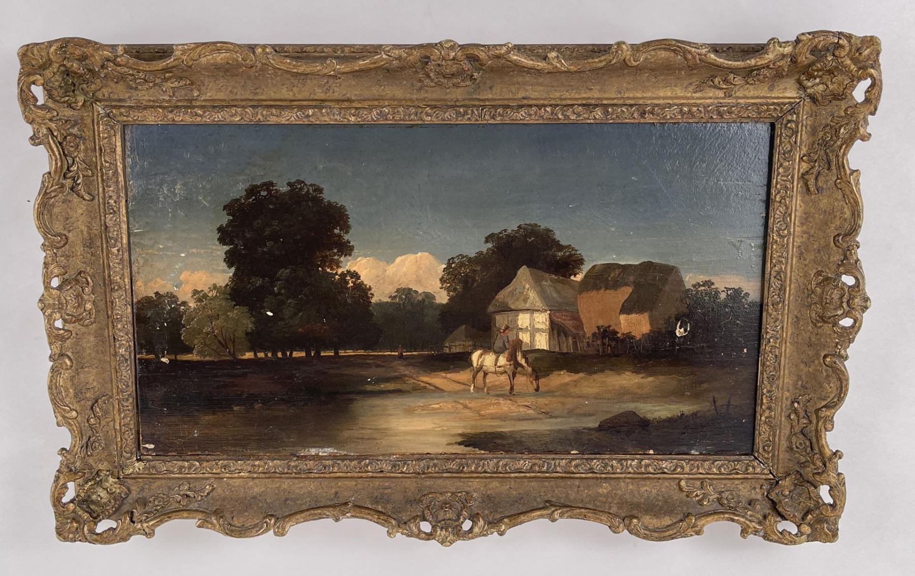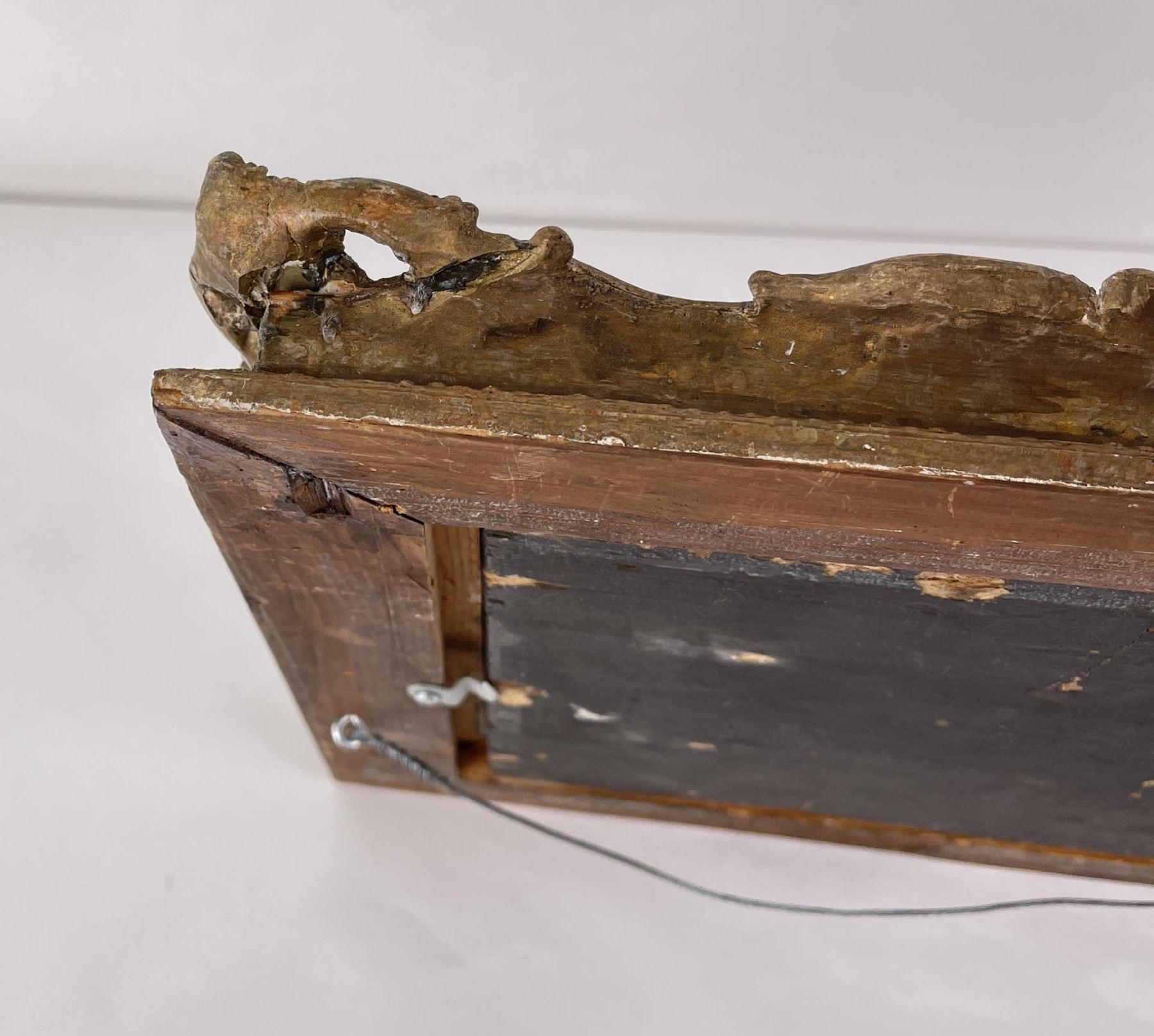 14" by 22 1/2" framed. Oil on board. Unsigned. Frame was damaged and repaired.