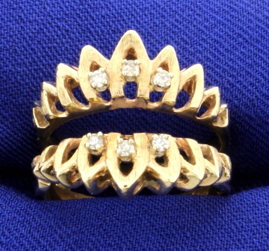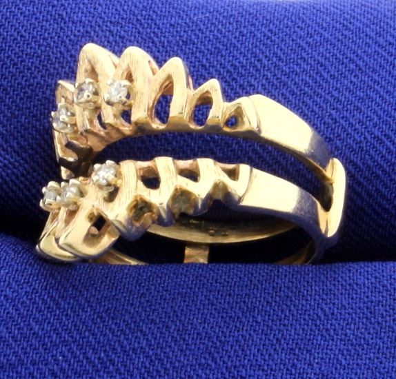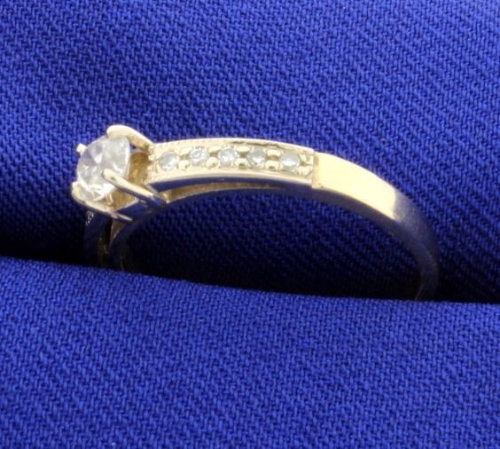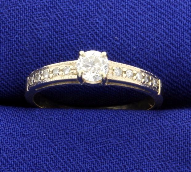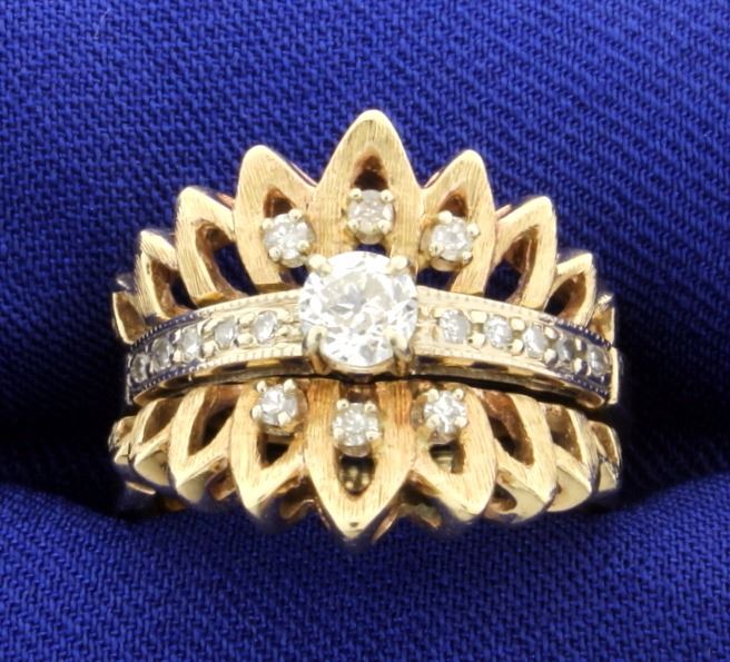 In 14K yellow gold, this diamond ring contains a .3ct mine cut diamond center stone and ten .01ct diamonds in shank. The jacket contains six .02ct diamonds, all diamonds are VS clarity, H color. Size 7 8.4g