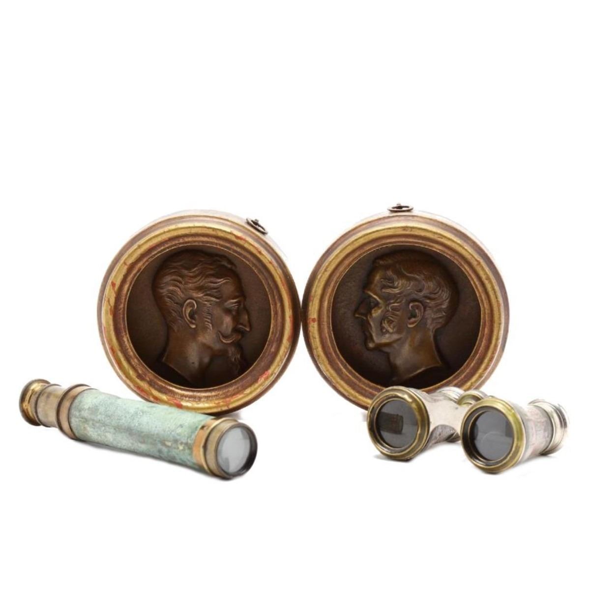 19th century, including a pair of repousse tin opera glasses, brass telescope and a pair of cast bronze plaques marked "Horace Vernet" and "Auber." Longest 6.5 in. CONDITION Plaques are loose in the frames; wear to cases of opera glasses and telescope. - 9210-021718-LA-0419
