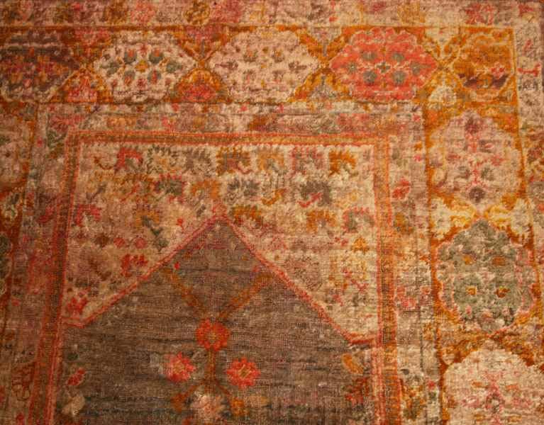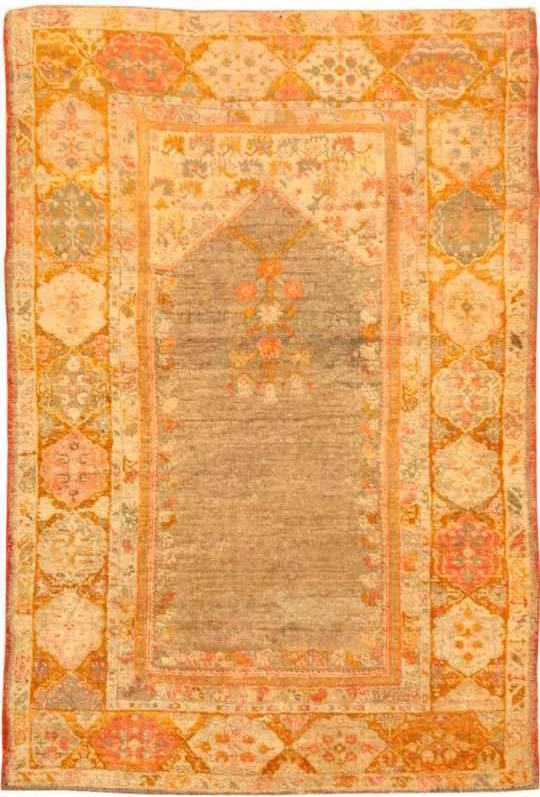 4.03 x 6.04 Circa 1900 Antique Angora Oushak Rug, Turkey - Angora Oushaks are known for their lustrous wool. This intriguing prayer rug contains hanging flowers in the prayer arch framed by lovely floral cartouches. The saffron-golden tonality make this a beautiful rug to light up any room.