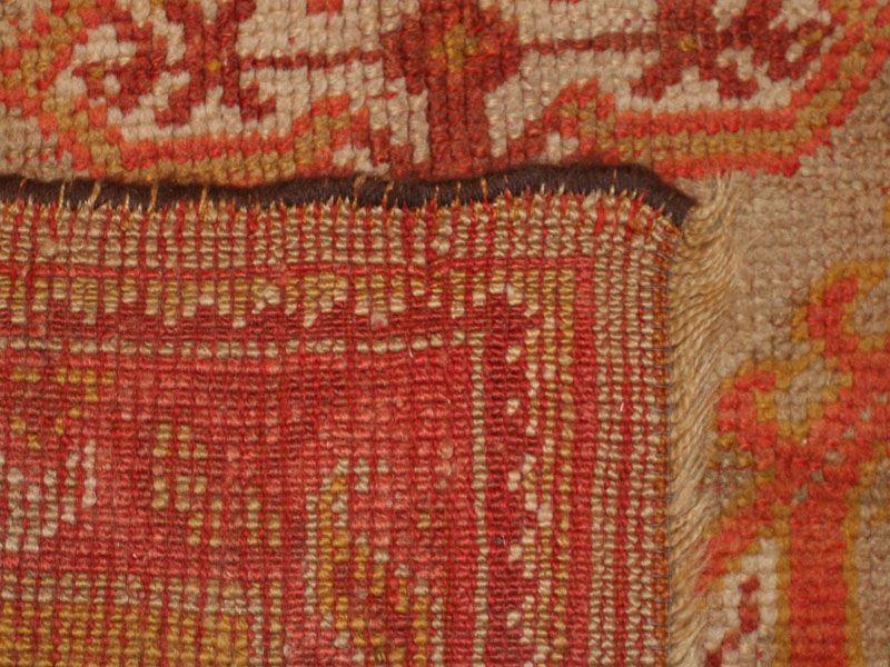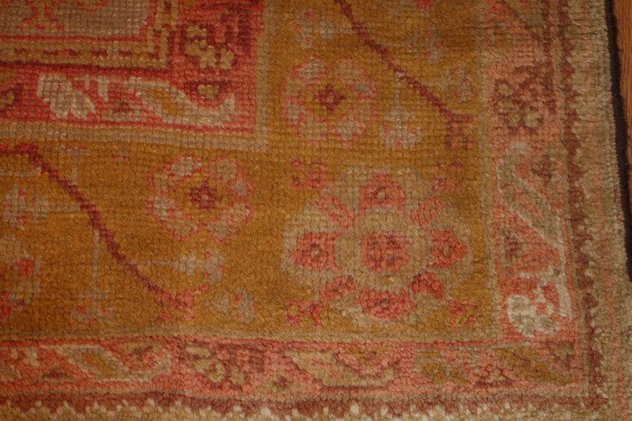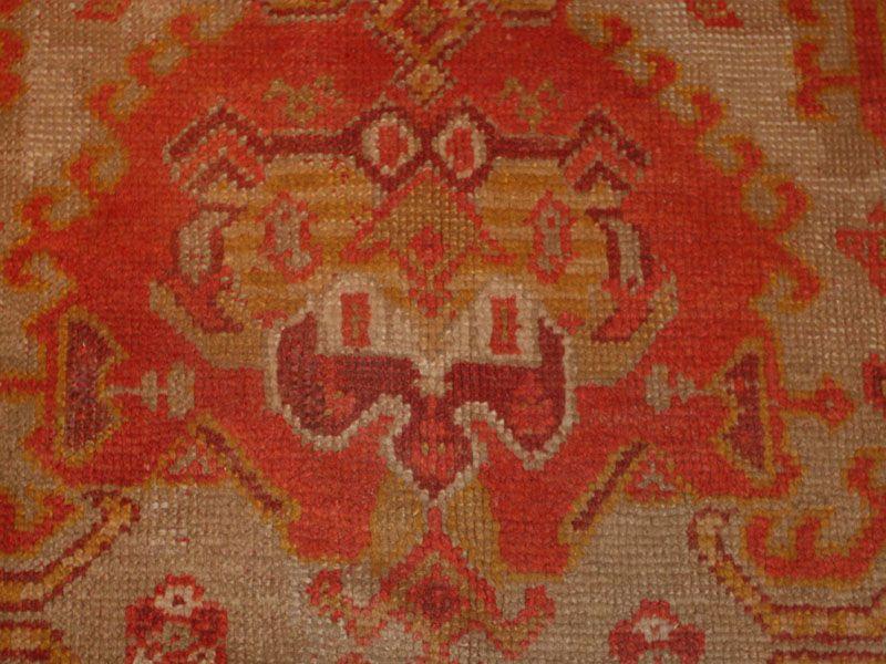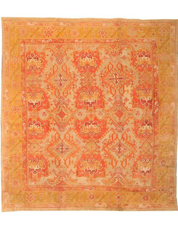 10.04 x 11.00 Late nineteenth century Antique Oushak / Ushak Turkish Rug - This richly decorative antique Oushak has a powerful allover design of staggered terracotta and ivory medallions repeating across a warm, sandy ground. Though large and closely spaced, the medallions are rendered as crisply geometric openwork forms, allowing the ground to show through, and imparting a more spacious quality to the entire composition. The delicate border of rosettes nicely contrasts the larger scale of the field design, but retaining the same coloration for balance and overall unity.