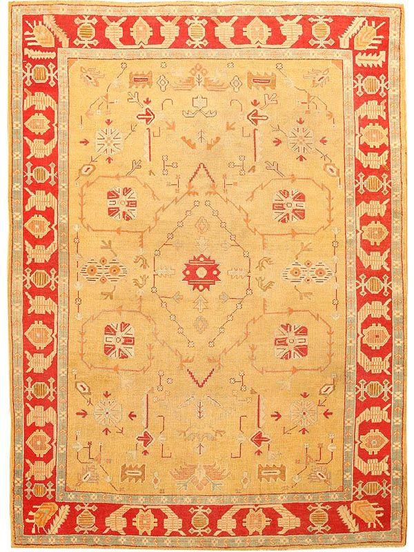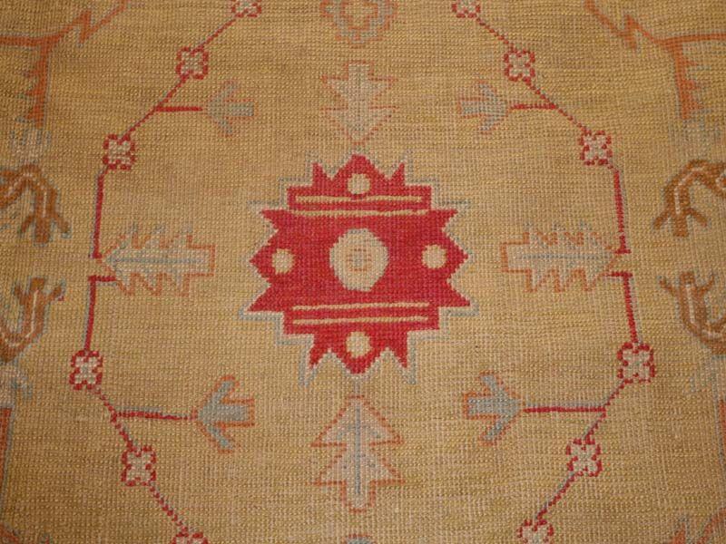 8.06 x 12.00 Circa 1900 Antique Oushak, Turkey - At first glance, this striking antique Oushak appears to have an allover design. A closer look reveals the delicate linear outline of a star medallion derived from the classical Turkish Ushak carpets of the sixteenth and seventeenth centuries. Stylized floral sprays fill the areas above and below the medallion, continuing its design texture across the sandy field. A stylized arabesque vinescroll is set boldly against a persimmon ground, providing a monumental contrast to the delicacy and linearity of the field.