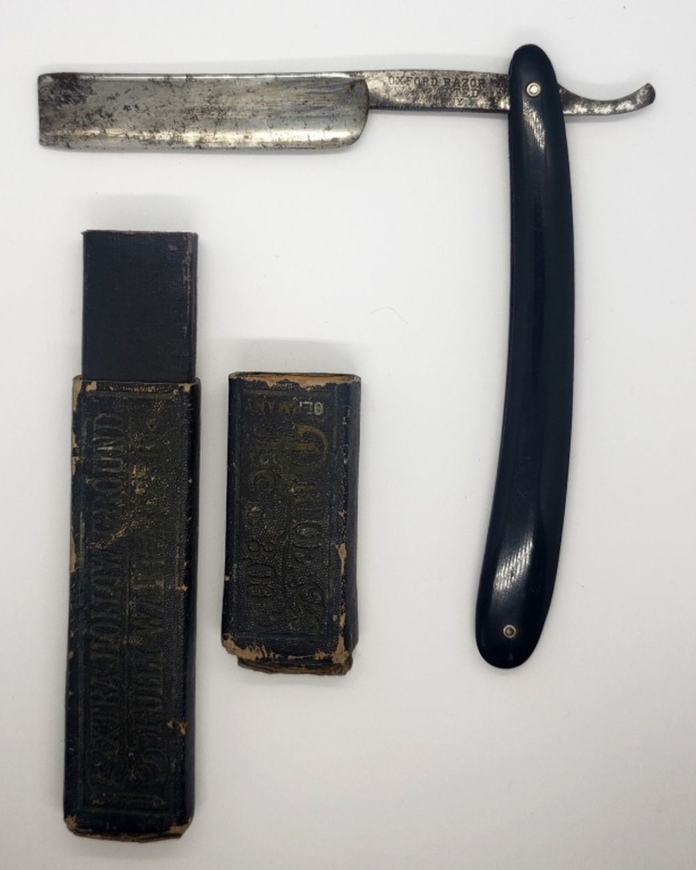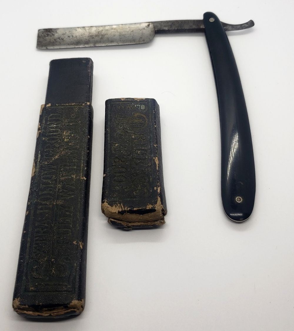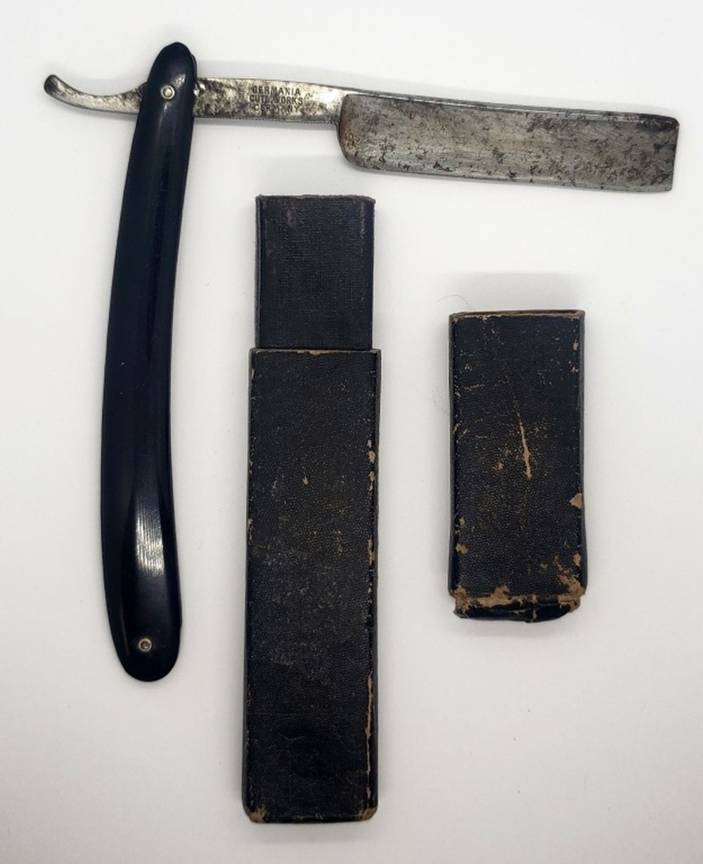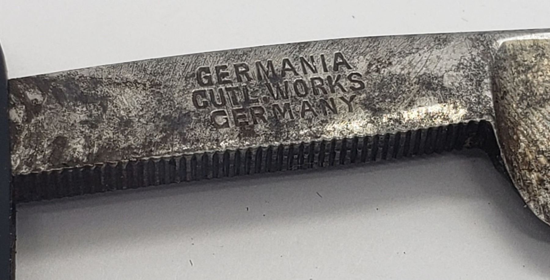 Warrented Germania Cutlery Works. Needs a light cleaning. No cracks on the screws. Has razor packaging (unkown if its original)