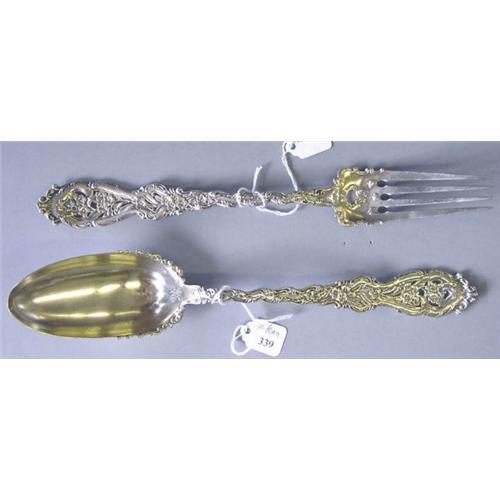 This is an exceptional matching sterling silver serving fork and knife by Whiting Manufacturing Co. of New York. They carry the White maker's mark but we've found no date code, suggesting the set dates from sometime prior to 1905 when Whiting instituted a date coding system. Each measures 10 3/4 inches long and the total weight is 8.2 ounces. Light monogram. Thanks for visiting. Please let us know if you have any questions or comments.