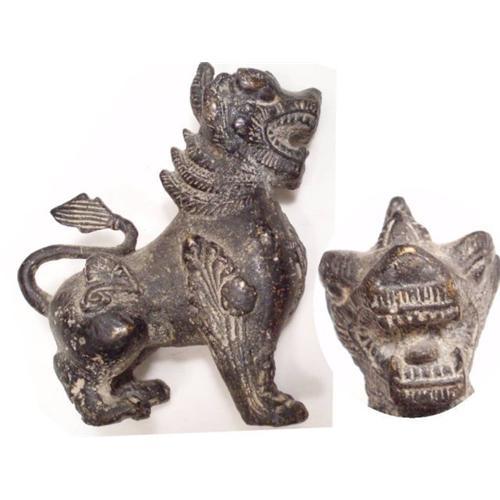This is a primitive metal Dragon or foo dog that came off an old monument. We purchased it from an antique dealer who dealt only in Asian culture and they guaranteed this was primitive and was part of an old monument from a buddhist temple. In Chinese, These Fu or FOO Dogs are powerful mythic protectors that have traditionally stood in front of Chinese Imperial palaces, temples, emperors' tombs,. This is really heavy and he has a great amount of detail on all the way down to his flair tail. This measures 3 1/2" tall and 4" long. He is in great shape with no chips and or nicks. Lots of lovely old patina on this.