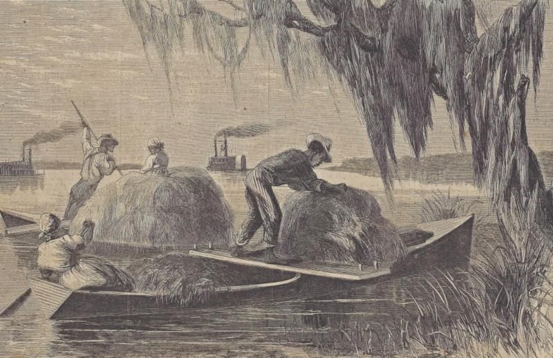 ORIGINAL Antique PRINT scene Gathering Moss on Berwick Bay Louisiana, Pictures of the South, sketched by A.R. Waud (NOT A REPRODUCTION) that was createdand produced, using a wood cut (Scene carved out of a wood block). One of several that were