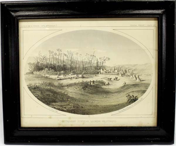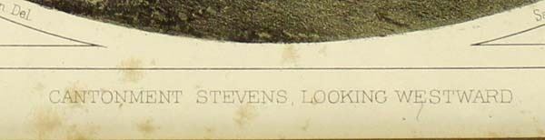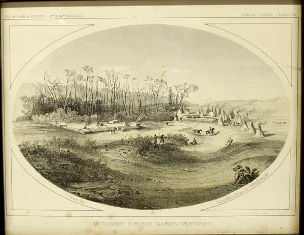 Pacific Railroad Survey (USPRR) Lithograph ''Cantonment Stevens, Looking West'', visual measures 7.5'' x 9.5'', top of the print reads ''USPRR EXP & SURVEYS - 47th & 49th PARALLELS'' and on the opposite side reads ''GENERAL REPORT PLATE LIX'', at the bottom of the picture reads ''G. Sohon Del.'' and ''Sarcony, Major, & Knapp Lithographers 449 Broadway St.'', bottom reads ''Catonment Stevens, Looking Westward'', date issued 1855-1860, Gustave Sohon (1825-1903), from Volume XII, this view was drawn by John Mix Stanley from a sketch by R. H. Kern